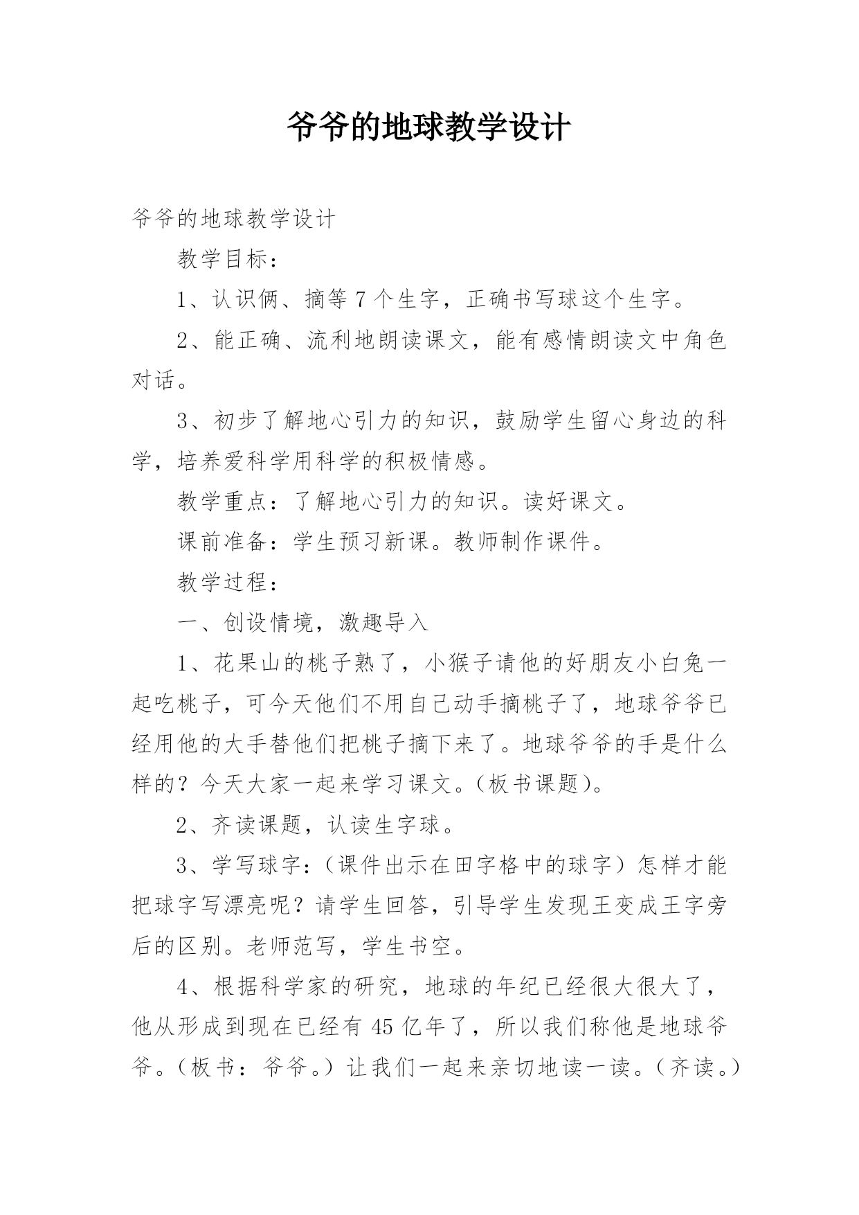 爷爷的地球教学设计爷爷的地球教学设计教学目标:1、认识俩、摘等7个生字,正确书写球这个生字。2、能正确、流利地朗读课文,能有感情朗读文中角色对话。3、初步了解地心引力的知识,鼓励学生留心身边的科学,培养爱科学用科学的积极情感。教学重点:了解地心引力的知识。读好课文。课前准备:学生预习新课。教师制作课件。教学过程:一、创设情境,激趣导入1、花果山的桃子熟了,小猴子请他的好朋友小白兔一起吃桃子,可今天他们不用自己动手摘桃子了,地球爷爷已经用他的大手替他们把桃子摘下来了。地球爷爷的手是什么样的?今天大家一起来学
