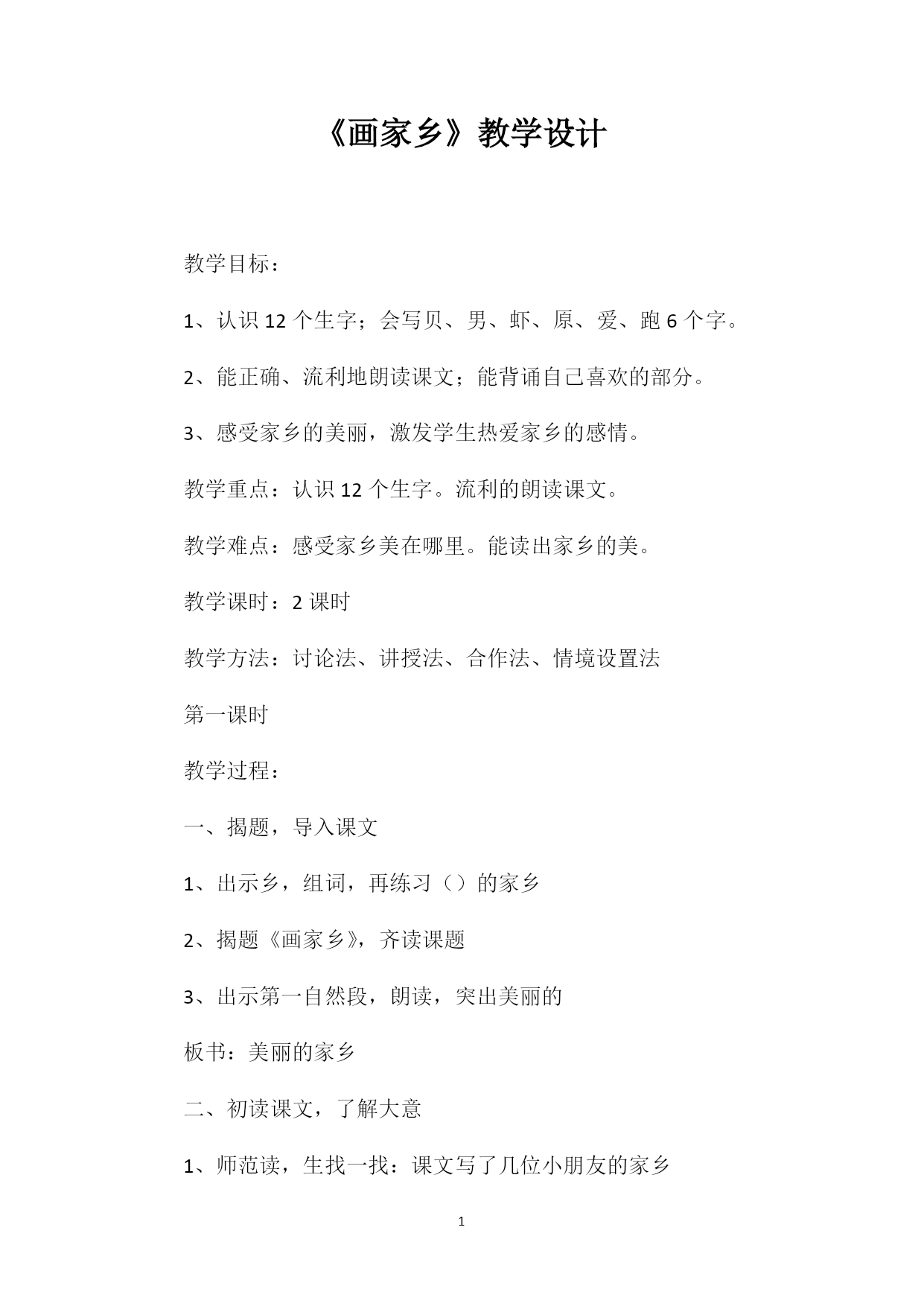PAGEPAGE6《画家乡》教学设计教学目标:1、认识12个生字;会写贝、男、虾、原、爱、跑6个字。2、能正确、流利地朗读课文;能背诵自己喜欢的部分。3、感受家乡的美丽,激发学生热爱家乡的感情。教学重点:认识12个生字。流利的朗读课文。教学难点:感受家乡美在哪里。能读出家乡的美。教学课时:2课时教学方法:讨论法、讲授法、合作法、情境设置法第一课时教学过程:一、揭题,导入课文1、出示乡,组词,再练习()的家乡2、揭题《画家乡》,齐读课题3、出示第一自然段,朗读,突出美丽的板书:美丽的家乡二、初读