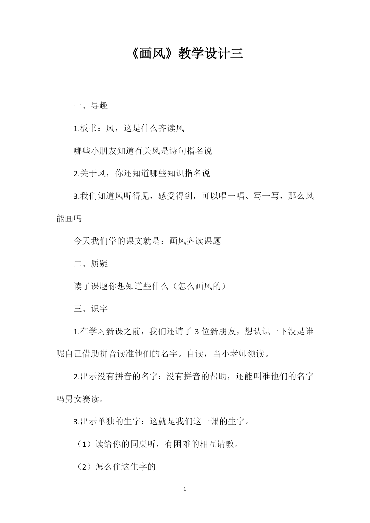 PAGEPAGE3《画风》教学设计三一、导趣1.板书:风,这是什么齐读风哪些小朋友知道有关风是诗句指名说2.关于风,你还知道哪些知识指名说3.我们知道风听得见,感受得到,可以唱一唱、写一写,那么风能画吗今天我们学的课文就是:画风齐读课题二、质疑读了课题你想知道些什么(怎么画风的)三、识字1.在学习新课之前,我们还请了3位新朋友,想认识一下没是谁呢自己借助拼音读准他们的名字。自读,当小老师领读。2.出示没有拼音的名字:没有拼音的帮助,还能叫准他们的名字吗男女赛读。3.出示单独的生字:这就是我们这