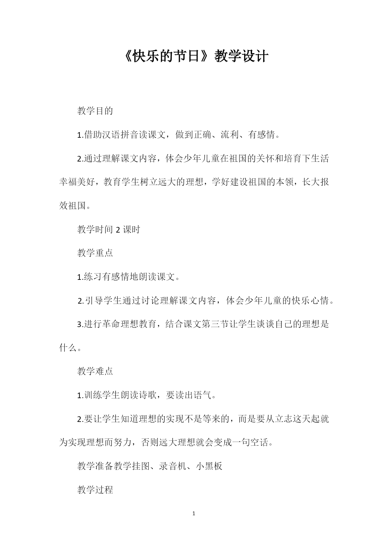 PAGEPAGE6《快乐的节日》教学设计教学目的1.借助汉语拼音读课文,做到正确、流利、有感情。2.通过理解课文内容,体会少年儿童在祖国的关怀和培育下生活幸福美好,教育学生树立远大的理想,学好建设祖国的本领,长大报效祖国。教学时间2课时教学重点1.练习有感情地朗读课文。2.引导学生通过讨论理解课文内容,体会少年儿童的快乐心情。3.进行革命理想教育,结合课文第三节让学生谈谈自己的理想是什么。教学难点1.训练学生朗读诗歌,要读出语气。2.要让学生知道理想的实现不是等来的,而是要从立志这天起就为实现