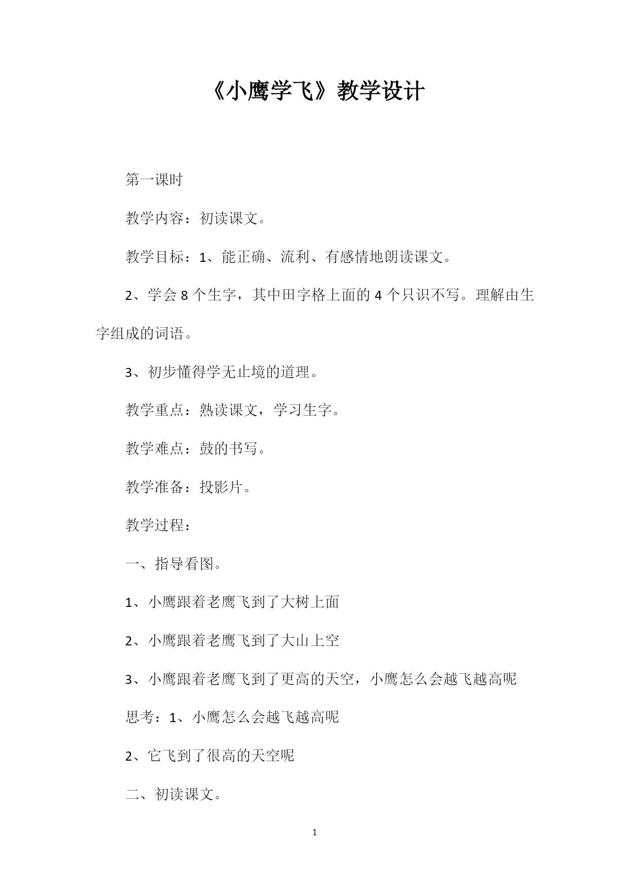 PAGEPAGE6《小鹰学飞》教学设计第一课时教学内容:初读课文。教学目标:1、能正确、流利、有感情地朗读课文。2、学会8个生字,其中田字格上面的4个只识不写。理解由生字组成的词语。3、初步懂得学无止境的道理。教学重点:熟读课文,学习生字。教学难点:鼓的书写。教学准备:投影片。教学过程:一、指导看图。1、小鹰跟着老鹰飞到了大树上面2、小鹰跟着老鹰飞到了大山上空3、小鹰跟着老鹰飞到了更高的天空,小鹰怎么会越飞越高呢思考:1、小鹰怎么会越飞越高呢2、它飞到了很高的天空呢二、初读课文。1、自由拼读,