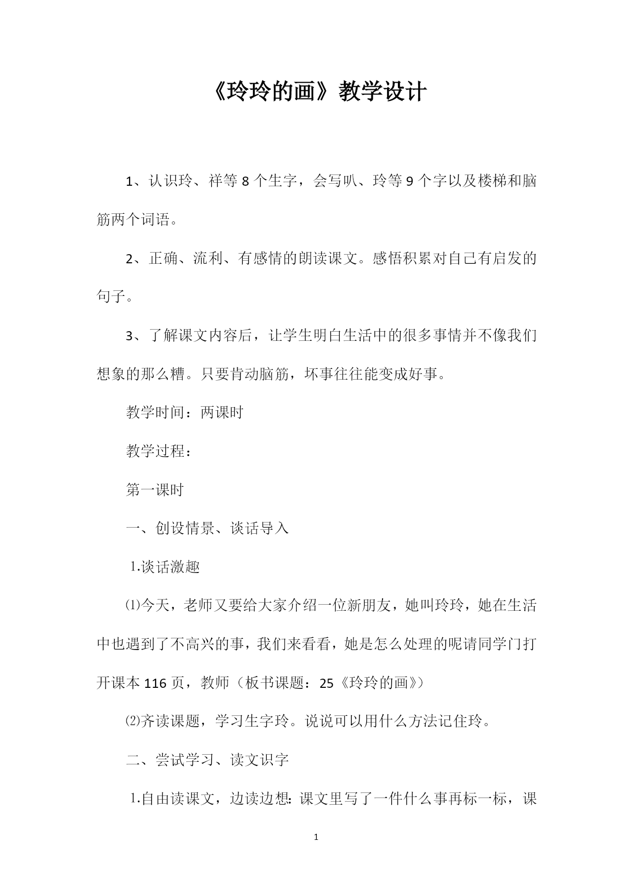 PAGEPAGE4《玲玲的画》教学设计1、认识玲、祥等8个生字,会写叭、玲等9个字以及楼梯和脑筋两个词语。2、正确、流利、有感情的朗读课文。感悟积累对自己有启发的句子。3、了解课文内容后,让学生明白生活中的很多事情并不像我们想象的那么糟。只要肯动脑筋,坏事往往能变成好事。教学时间:两课时教学过程:第一课时一、创设情景、谈话导入⒈谈话激趣⑴今天,老师又要给大家介绍一位新朋友,她叫玲玲,她在生活中也遇到了不高兴的事,我们来看看,她是怎么处理的呢请同学门打开课本116页,教师(板书课题:25《玲玲的