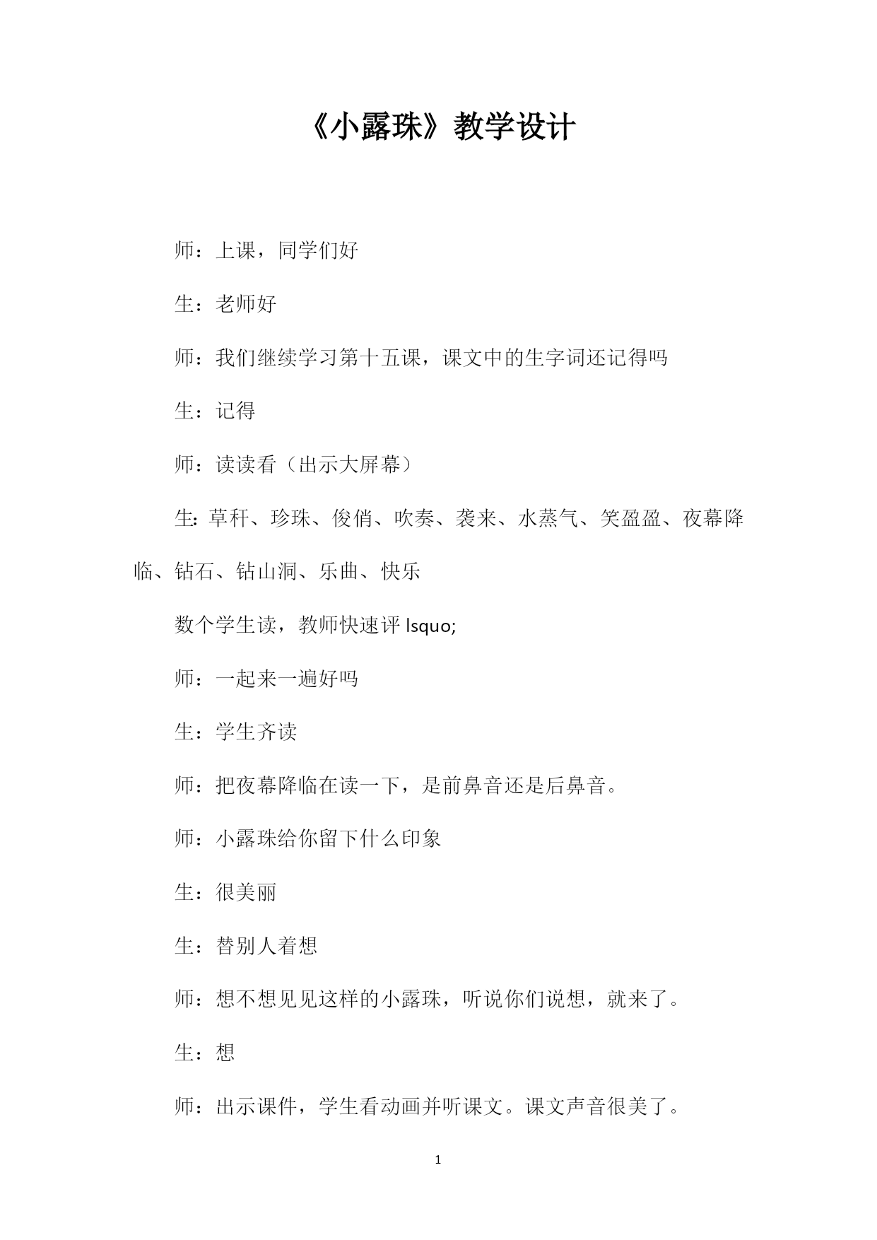 PAGEPAGE9《小露珠》教学设计师:上课,同学们好生:老师好师:我们继续学习第十五课,课文中的生字词还记得吗生:记得师:读读看(出示大屏幕)生:草秆、珍珠、俊俏、吹奏、袭来、水蒸气、笑盈盈、夜幕降临、钻石、钻山洞、乐曲、快乐数个学生读,教师快速评lsquo;师:一起来一遍好吗生:学生齐读师:把夜幕降临在读一下,是前鼻音还是后鼻音。师:小露珠给你留下什么印象生:很美丽生:替别人着想师:想不想见见这样的小露珠,听说你们说想,就来了。生:想师:出示课件,学生看动画并听课文。课文声音很美了。师:刚
