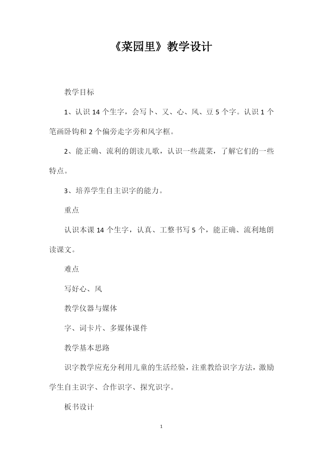 PAGEPAGE3《菜园里》教学设计教学目标1、认识14个生字,会写卜、又、心、风、豆5个字。认识1个笔画卧钩和2个偏旁走字旁和风字框。2、能正确、流利的朗读儿歌,认识一些蔬菜,了解它们的一些特点。3、培养学生自主识字的能力。重点认识本课14个生字,认真、工整书写5个,能正确、流利地朗读课文。难点写好心、风教学仪器与媒体字、词卡片、多媒体课件教学基本思路识字教学应充分利用儿童的生活经验,注重教给识字方法,激励学生自主识字、合作识字、探究识字。板书设计3菜园里菜园豆角萝卜心细又捉迷藏嘴越教学过程