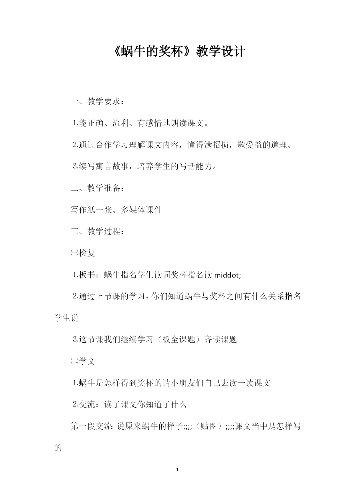 PAGEPAGE4《蜗牛的奖杯》教学设计一、教学要求:⒈能正确、流利、有感情地朗读课文。⒉通过合作学习理解课文内容,懂得满招损,歉受益的道理。⒊续写寓言故事,培养学生的写话能力。二、教学准备:写作纸一张、多媒体课件三、教学过程:㈠检复⒈板书:蜗牛指名学生读词奖杯指名读middot;⒉通过上节课的学习,你们知道蜗牛与奖杯之间有什么关系指名学生说⒊这节课我们继续学习(板全课题)齐读课题㈡学文⒈蜗牛是怎样得到奖杯的请小朋友们自己去读一读课文⒉交流:读了课文你知道了什么第一段交流:说原来蜗牛的样子;;