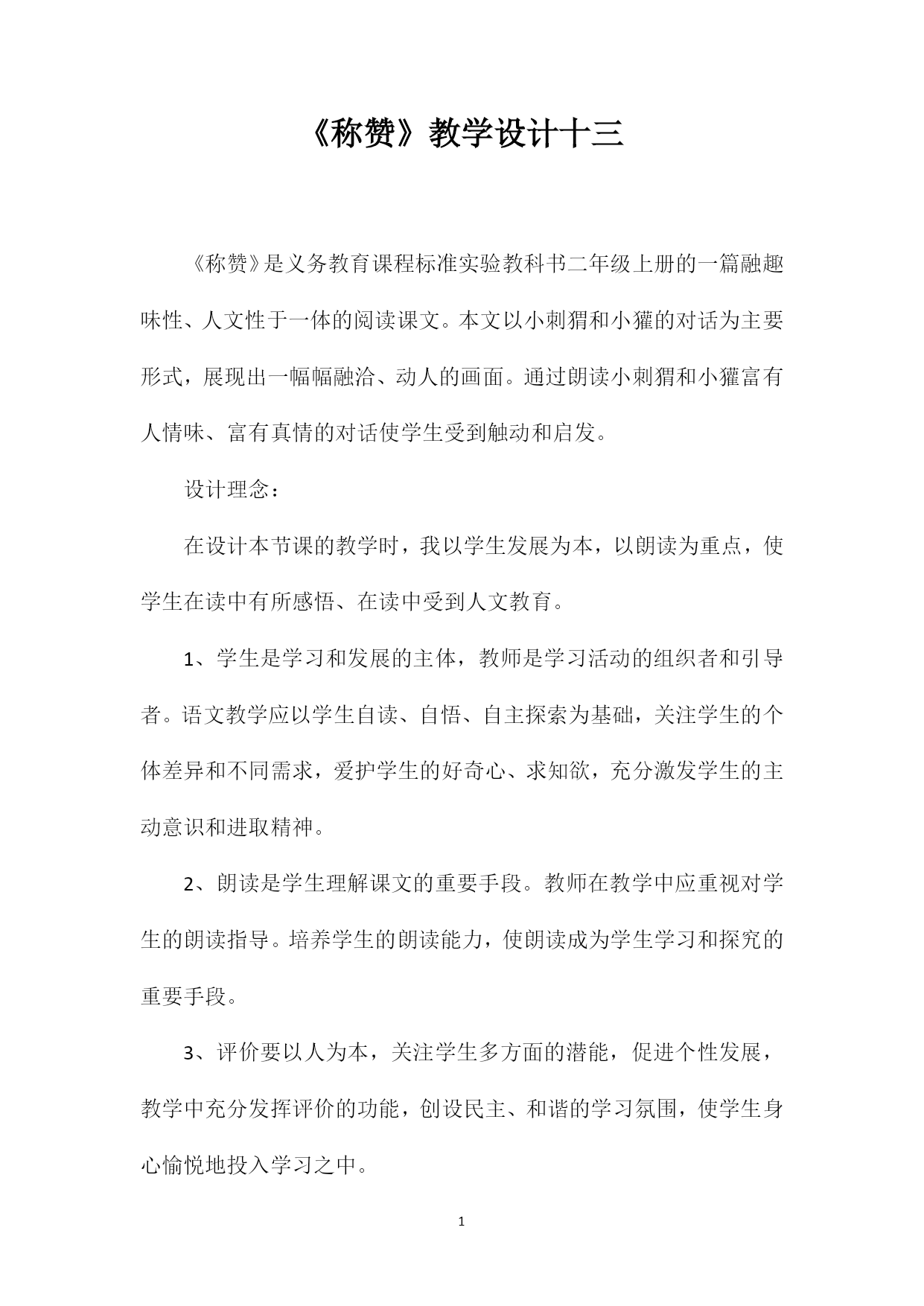 PAGEPAGE6《称赞》教学设计十三《称赞》是义务教育课程标准实验教科书二年级上册的一篇融趣味性、人文性于一体的阅读课文。本文以小刺猬和小獾的对话为主要形式,展现出一幅幅融洽、动人的画面。通过朗读小刺猬和小獾富有人情味、富有真情的对话使学生受到触动和启发。设计理念:在设计本节课的教学时,我以学生发展为本,以朗读为重点,使学生在读中有所感悟、在读中受到人文教育。1、学生是学习和发展的主体,教师是学习活动的组织者和引导者。语文教学应以学生自读、自悟、自主探索为基础,关注学生的个体差异和不同需求,