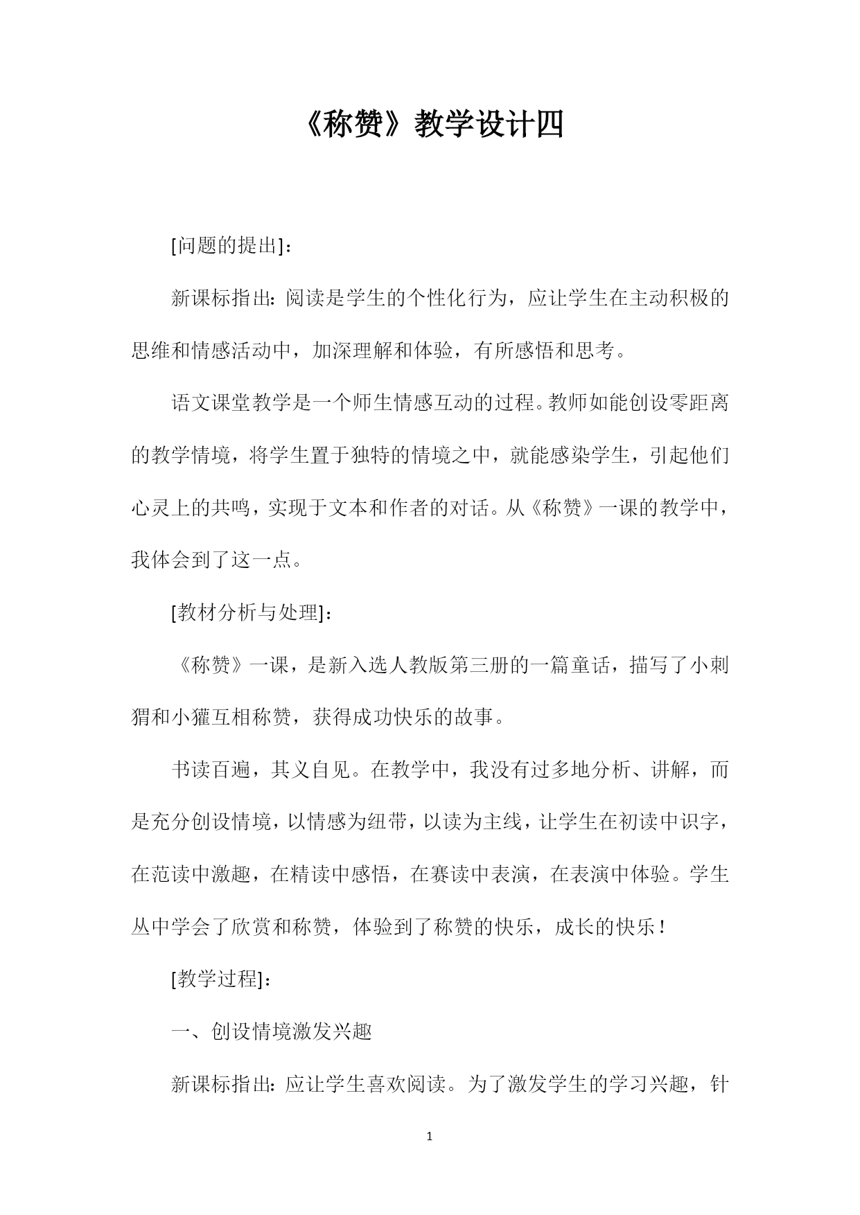 PAGEPAGE3《称赞》教学设计四[问题的提出]:新课标指出:阅读是学生的个性化行为,应让学生在主动积极的思维和情感活动中,加深理解和体验,有所感悟和思考。语文课堂教学是一个师生情感互动的过程。教师如能创设零距离的教学情境,将学生置于独特的情境之中,就能感染学生,引起他们心灵上的共鸣,实现于文本和作者的对话。从《称赞》一课的教学中,我体会到了这一点。[教材分析与处理]:《称赞》一课,是新入选人教版第三册的一篇童话,描写了小刺猬和小獾互相称赞,获得成功快乐的故事。书读百遍,其义自见。在教学中,