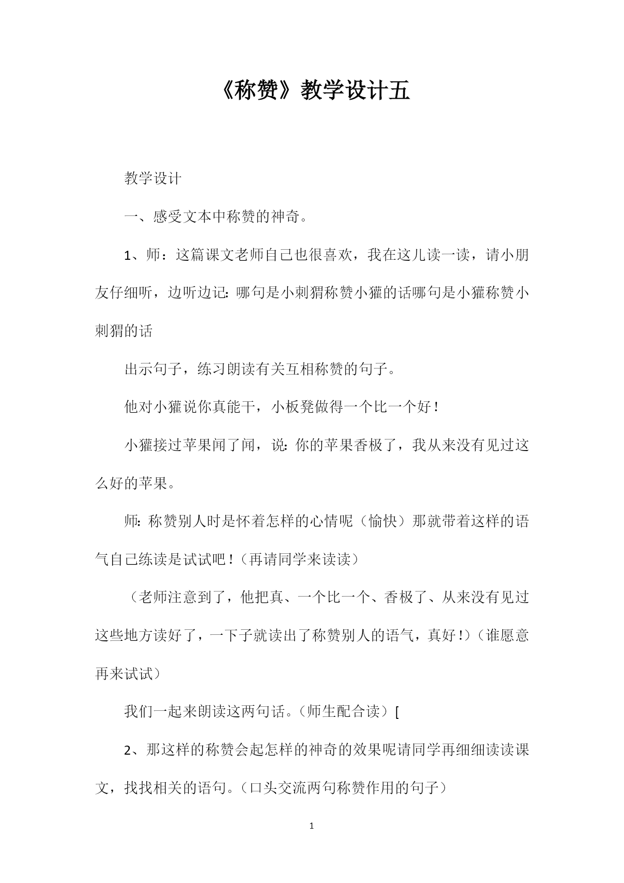 PAGEPAGE14《称赞》教学设计五教学设计一、感受文本中称赞的神奇。1、师:这篇课文老师自己也很喜欢,我在这儿读一读,请小朋友仔细听,边听边记:哪句是小刺猬称赞小獾的话哪句是小獾称赞小刺猬的话出示句子,练习朗读有关互相称赞的句子。他对小獾说你真能干,小板凳做得一个比一个好!小獾接过苹果闻了闻,说:你的苹果香极了,我从来没有见过这么好的苹果。师:称赞别人时是怀着怎样的心情呢(愉快)那就带着这样的语气自己练读是试试吧!(再请同学来读读)(老师注意到了,他把真、一个比一个、香极了、从来没有见过这