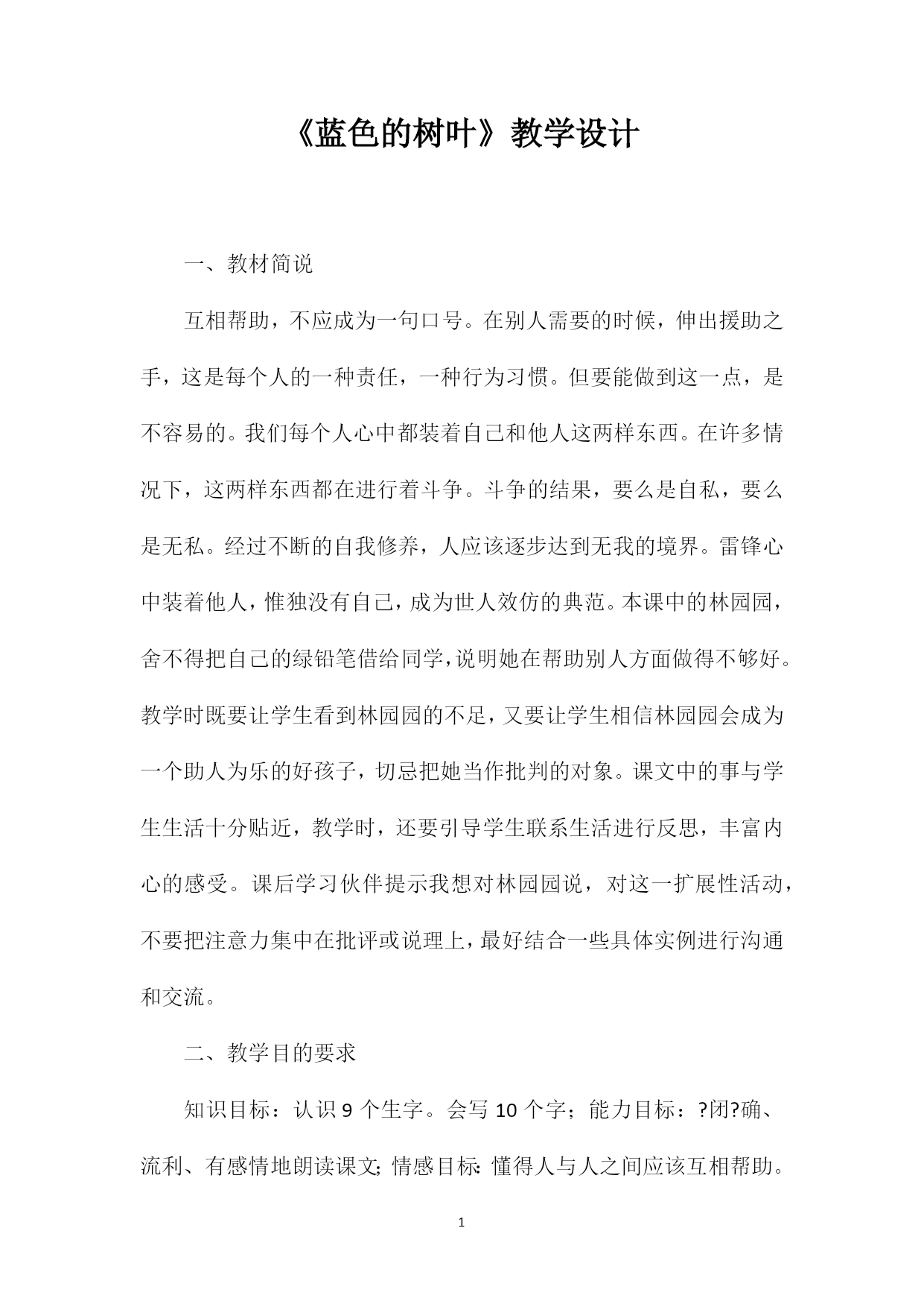 PAGEPAGE5《蓝色的树叶》教学设计一、教材简说互相帮助,不应成为一句口号。在别人需要的时候,伸出援助之手,这是每个人的一种责任,一种行为习惯。但要能做到这一点,是不容易的。我们每个人心中都装着自己和他人这两样东西。在许多情况下,这两样东西都在进行着斗争。斗争的结果,要么是自私,要么是无私。经过不断的自我修养,人应该逐步达到无我的境界。雷锋心中装着他人,惟独没有自己,成为世人效仿的典范。本课中的林园园,舍不得把自己的绿铅笔借给同学,说明她在帮助别人方面做得不够好。教学时既要让学生看到林园园