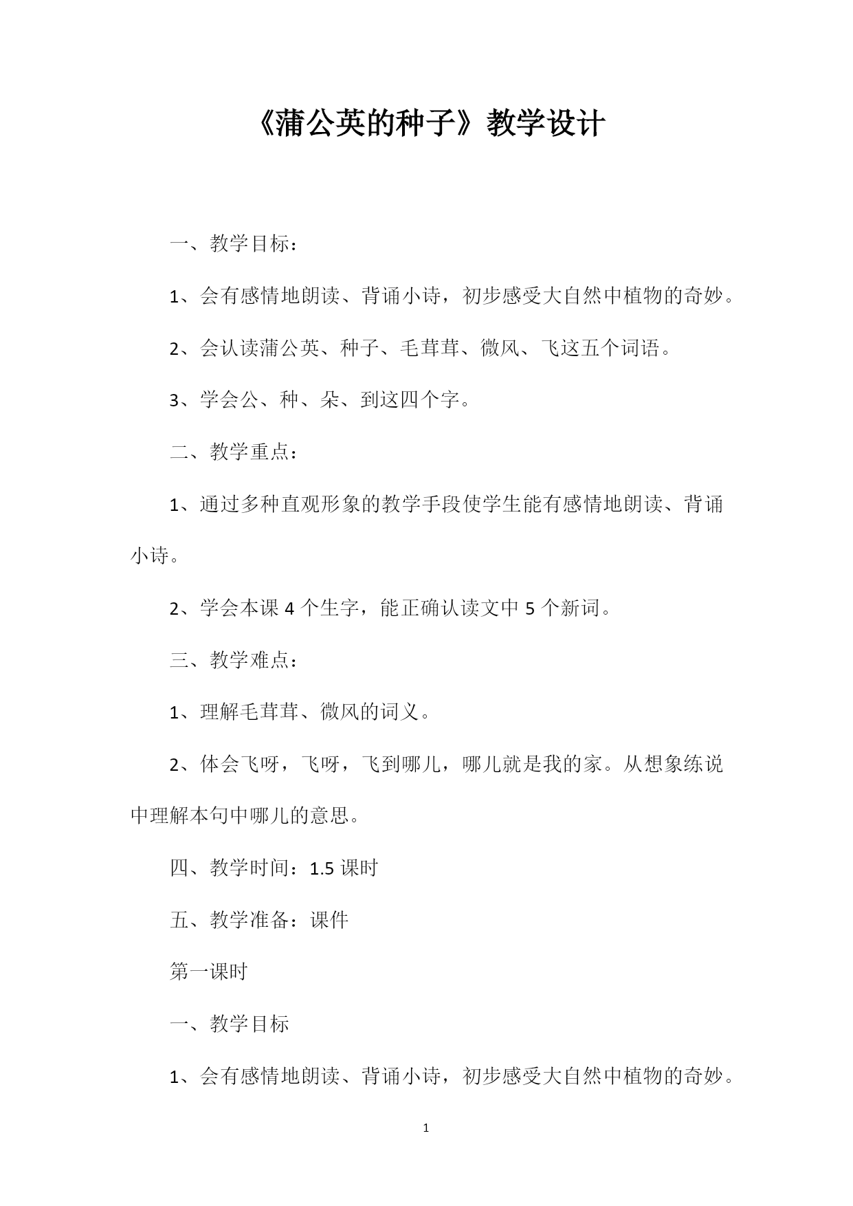 PAGEPAGE3《蒲公英的种子》教学设计一、教学目标:1、会有感情地朗读、背诵小诗,初步感受大自然中植物的奇妙。2、会认读蒲公英、种子、毛茸茸、微风、飞这五个词语。3、学会公、种、朵、到这四个字。二、教学重点:1、通过多种直观形象的教学手段使学生能有感情地朗读、背诵小诗。2、学会本课4个生字,能正确认读文中5个新词。三、教学难点:1、理解毛茸茸、微风的词义。2、体会飞呀,飞呀,飞到哪儿,哪儿就是我的家。从想象练说中理解本句中哪儿的意思。四、教学时间:1.5课时五、教学准备:课件第一课时一、教