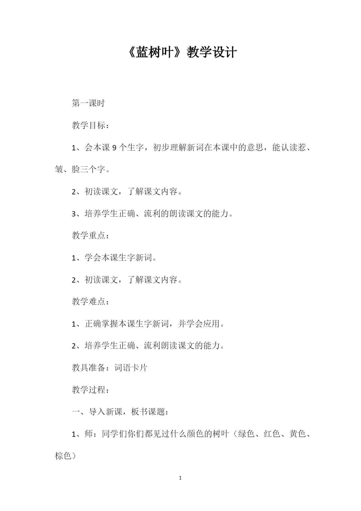 PAGEPAGE8《蓝树叶》教学设计第一课时教学目标:1、会本课9个生字,初步理解新词在本课中的意思,能认读惹、皱、脸三个字。2、初读课文,了解课文内容。3、培养学生正确、流利的朗读课文的能力。教学重点:1、学会本课生字新词。2、初读课文,了解课文内容。教学难点:1、正确掌握本课生字新词,并学会应用。2、培养学生正确、流利朗读课文的能力。教具准备:词语卡片教学过程:一、导入新课,板书课题:1、师:同学们你们都见过什么颜色的树叶(绿色、红色、黄色、棕色)2、那么,谁见过蓝色的树叶呢为什么会有蓝色