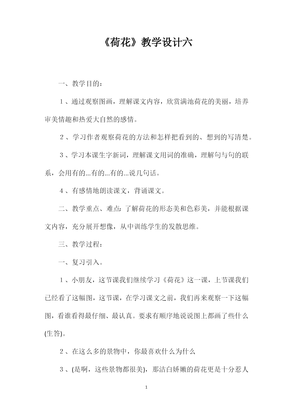 PAGEPAGE7《荷花》教学设计六一、教学目的:1、通过观察图画,理解课文内容,欣赏满池荷花的美丽,培养审美情趣和热爱大自然的感情。2、学习作者观察荷花的方法和怎样把看到的、想到的写清楚。3、学习本课生字新词,理解课文用词的准确,理解句与句的联系,会用有的...有的...有的...说几句话。4、有感情地朗读课文,背诵课文。二、教学重点、难点:了解荷花的形态美和色彩美,并能根据课文内容,充分展开想像,从中训练学生的发散思维。三、教学过程:一、复习引入。1、小朋友,这节课我们继续学习《荷花》这一