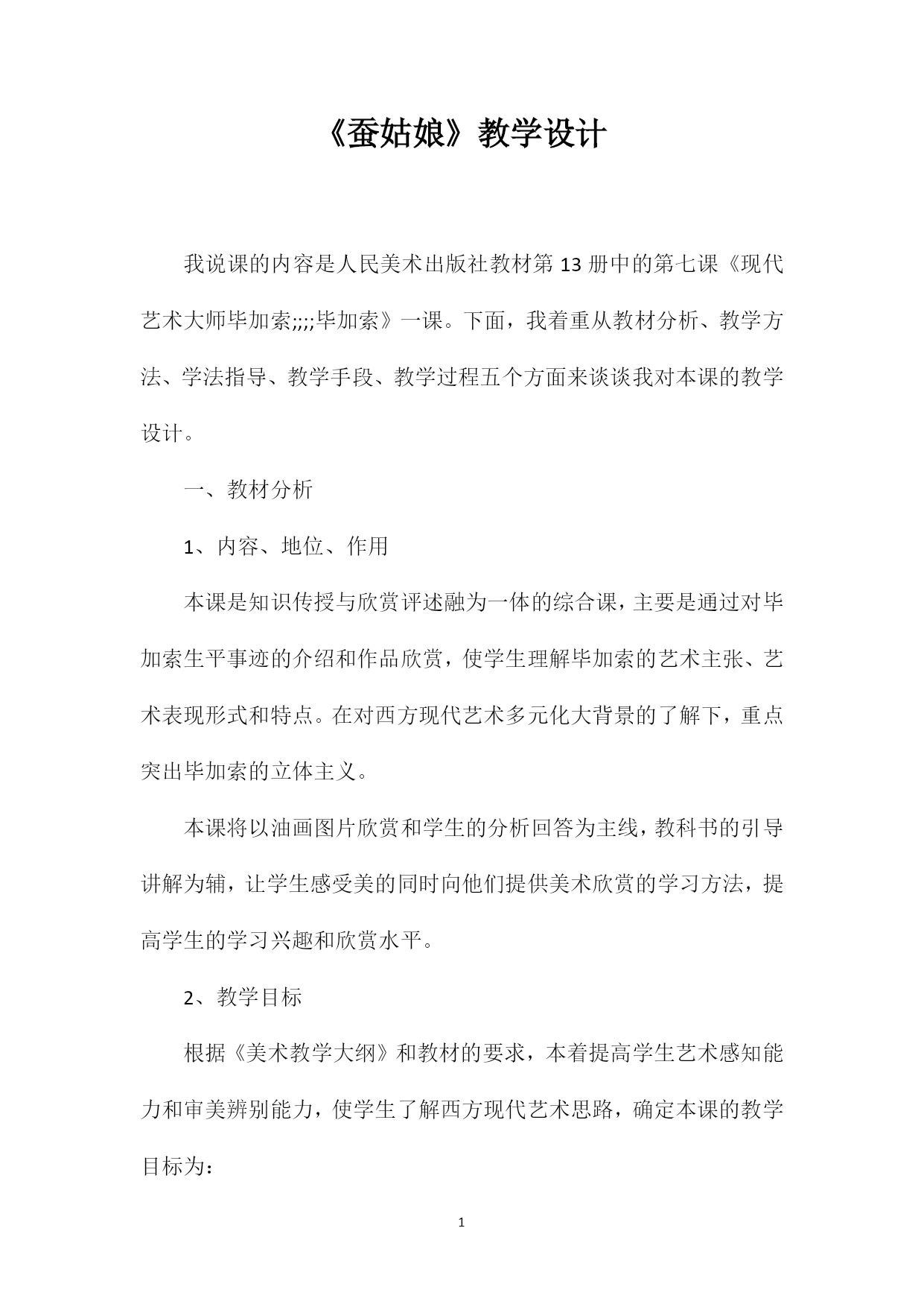 PAGEPAGE9《蚕姑娘》教学设计我说课的内容是人民美术出版社教材第13册中的第七课《现代艺术大师毕加索;;;;毕加索》一课。下面,我着重从教材分析、教学方法、学法指导、教学手段、教学过程五个方面来谈谈我对本课的教学设计。一、教材分析1、内容、地位、作用本课是知识传授与欣赏评述融为一体的综合课,主要是通过对毕加索生平事迹的介绍和作品欣赏,使学生理解毕加索的艺术主张、艺术表现形式和特点。在对西方现代艺术多元化大背景的了解下,重点突出毕加索的立体主义。本课将以油画图片欣赏和学生的分析回答为主线,