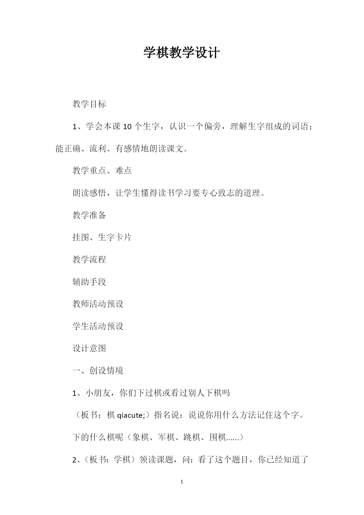 PAGEPAGE7学棋教学设计教学目标1、学会本课10个生字,认识一个偏旁,理解生字组成的词语;能正确、流利、有感情地朗读课文。教学重点、难点朗读感悟,让学生懂得读书学习要专心致志的道理。教学准备挂图、生字卡片教学流程辅助手段教师活动预设学生活动预设设计意图一、创设情境1、小朋友,你们下过棋或看过别人下棋吗(板书:棋qiacute;)指名说:说说你用什么方法记住这个字。下的什么棋呢(象棋、军棋、跳棋、围棋......)2、(板书:学棋)领读课题,问:看了这个题目,你已经知道了什么还想知道什么(