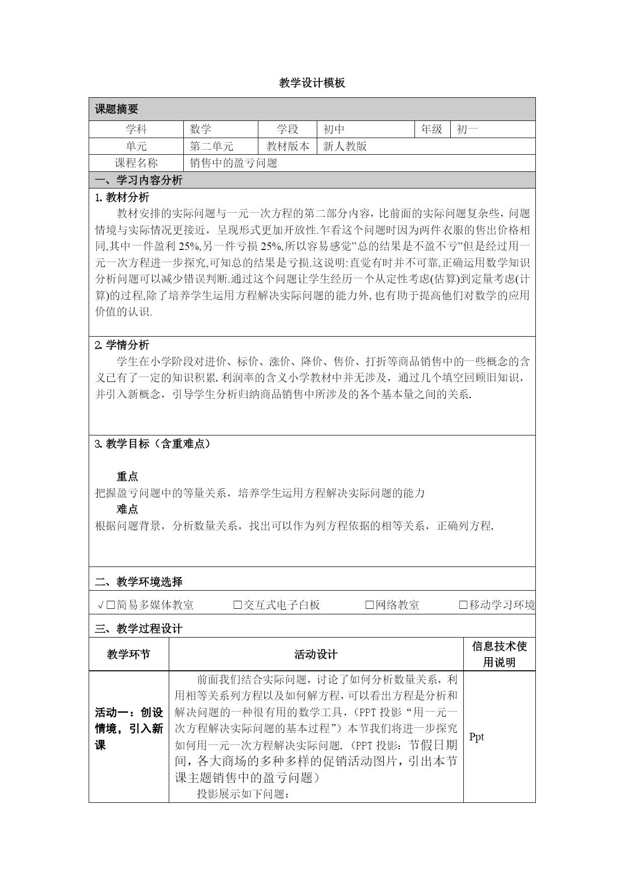 教学设计模板课题摘要学科数学学段初中年级初一单元第二单元教材版本新人教版课程名称销售中的盈亏问题一、学习内容分析1.教材分析教材安排的实际问题与一元一次方程的第二部分内容,比前面的实际问题复杂些,问题情境与实际情况更接近,呈现形式更加开放性.乍看这个问题时因为两件衣服的售出价格相同,其中一件盈利25%,另一件亏损25%,所以容易感觉”总的结果是不盈不亏”但是经过用一元一次方程进一步探究,可知总的结果是亏损.这说明:直觉有时并不可靠,正确运用数学知识分析问题可以减少错误判断.通过这个问题让学生经历一个从定性