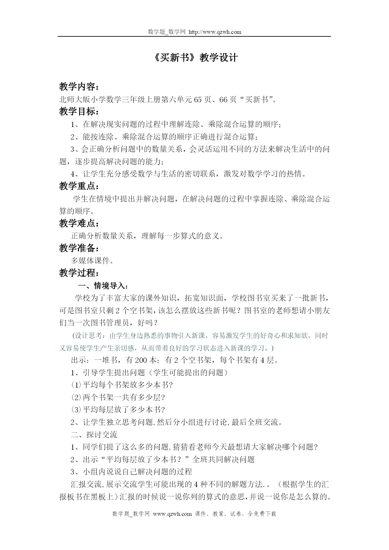 数学题_数学网http://www.qzwh.com数学题_数学网www.qzwh.com课件、教案、试卷,全免费下载《买新书》教学设计教学内容:北师大版小学数学三年级上册第六单元65页、66页“买新书”。教学目标:1、在解决现实问题的过程中理解连除、乘除混合运算的顺序;2、能按连除、乘除混合运算的顺序正确进行混合运算;3、会正确分析问题中的数量关系,会灵活运用不同的方法来解决生活中的问题,逐步提高解决问题的能力;4、让学生充分感受数学与生活的密切联系,激发对数学学习的热情。教学重点:学生在情境中提出并解