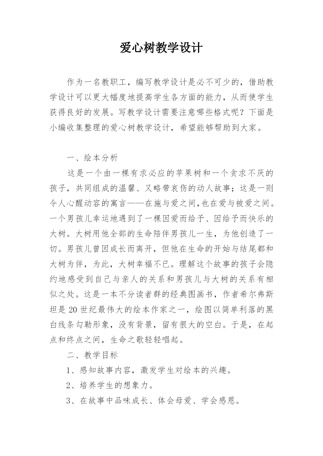 爱心树教学设计作为一名教职工,编写教学设计是必不可少的,借助教学设计可以更大幅度地提高学生各方面的能力,从而使学生获得良好的发展。写教学设计需要注意哪些格式呢?下面是小编收集整理的爱心树教学设计,希望能够帮助到大家。一、绘本分析这是一个由一棵有求必应的苹果树和一个贪求不厌的孩子,共同组成的温馨、又略带哀伤的动人故事;这是一则令人心醒动容的寓言——在施与爱之间,也在爱与被爱之间。一个男孩儿幸运地遇到了一棵因爱而给予、因给予而快乐的大树。大树用他全部的生命陪伴男孩儿一生,为他创造了一切。男孩儿曾因成长而离开,