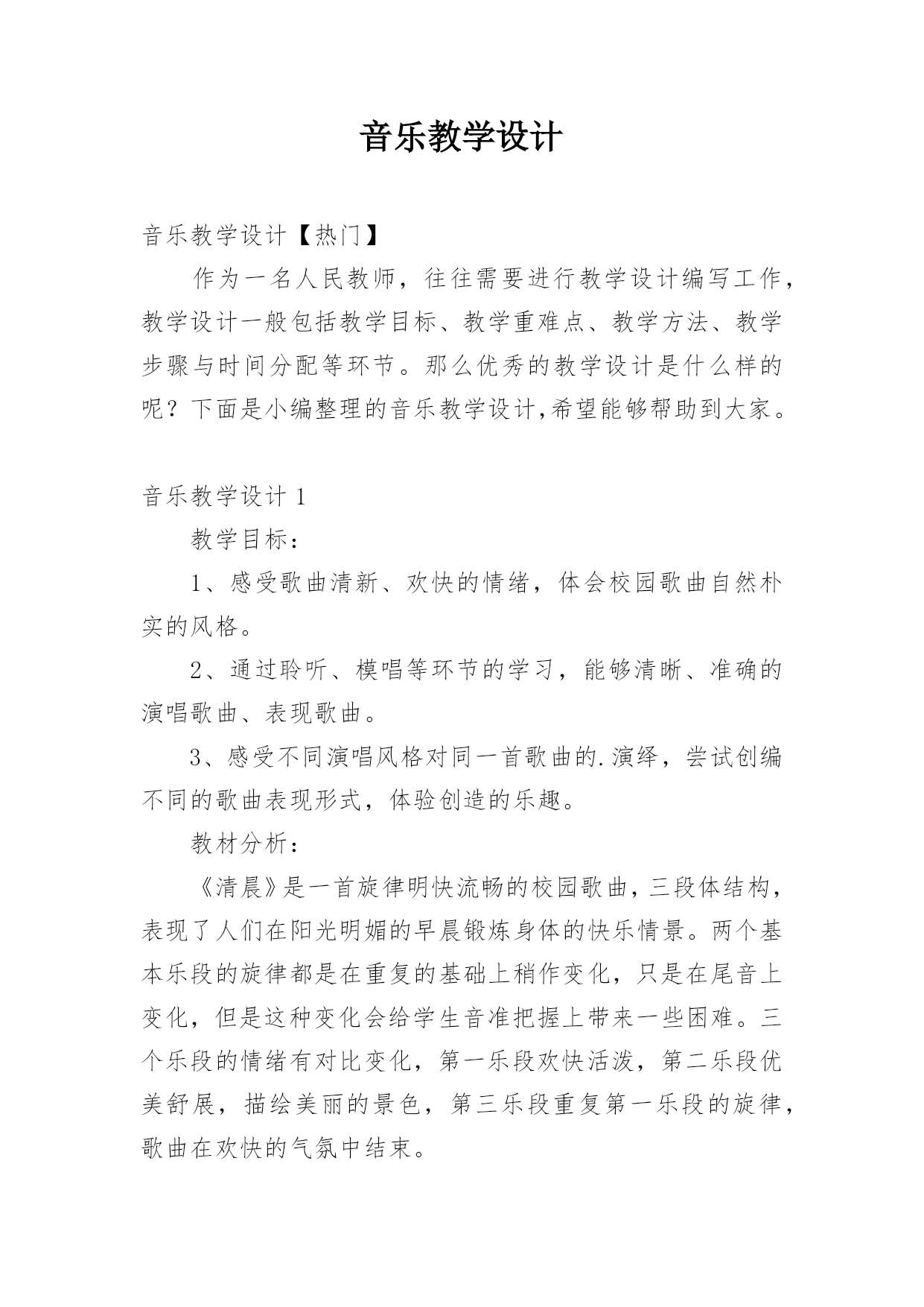音乐教学设计音乐教学设计【热门】作为一名人民教师,往往需要进行教学设计编写工作,教学设计一般包括教学目标、教学重难点、教学方法、教学步骤与时间分配等环节。那么优秀的教学设计是什么样的呢?下面是小编整理的音乐教学设计,希望能够帮助到大家。音乐教学设计1教学目标:1、感受歌曲清新、欢快的情绪,体会校园歌曲自然朴实的风格。2、通过聆听、模唱等环节的学习,能够清晰、准确的演唱歌曲、表现歌曲。3、感受不同演唱风格对同一首歌曲的.演绎,尝试创编不同的歌曲表现形式,体验创造的乐趣。教材分析:《清晨》是一首旋律明快流畅的