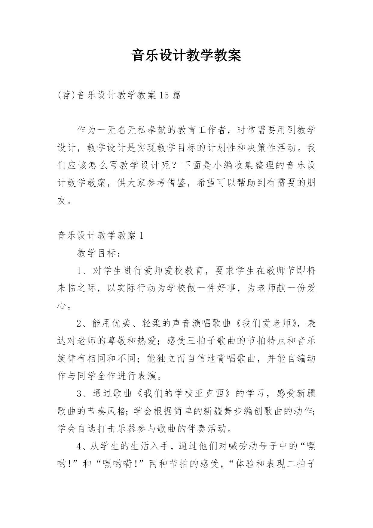 音乐设计教学教案(荐)音乐设计教学教案15篇作为一无名无私奉献的教育工作者,时常需要用到教学设计,教学设计是实现教学目标的计划性和决策性活动。我们应该怎么写教学设计呢?下面是小编收集整理的音乐设计教学教案,供大家参考借鉴,希望可以帮助到有需要的朋友。音乐设计教学教案1教学目标:1、对学生进行爱师爱校教育,要求学生在教师节即将来临之际,以实际行动为学校做一件好事,为老师献一份爱心。2、能用优美、轻柔的声音演唱歌曲《我们爱老师》,表达对老师的尊敬和热爱;感受三拍子歌曲的节拍特点和音乐旋律有相同和不同;能独立而