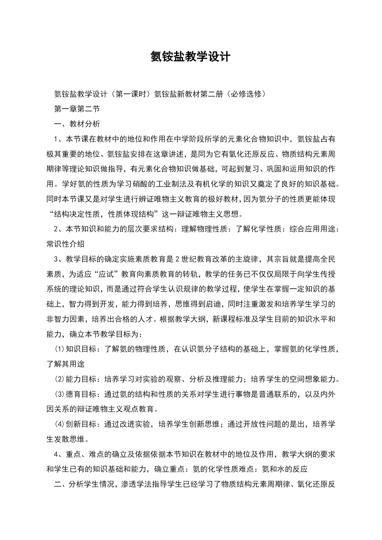 氨铵盐教学设计氨铵盐教学设计(第一课时)氨铵盐新教材第二册(必修选修)第一章第二节一、教材分析1、本节课在教材中的地位和作用在中学阶段所学的元素化合物知识中,氨铵盐占有极其重要的地位、氨铵盐安排在这章讲述,是同为它有氧化还原反应、物质结构元素周期律等理论知识做指导,有元素化合物知识做基础,可起到复习、巩固和运用知识的作用。学好氨的性质为学习硝酸的工业制法及有机化学的知识又奠定了良好的知识基础。同时本节课又是对学生进行辨证唯物主义教育的极好教材,因为氨分子的性质更能体现“结构决定性质,性质体现结构”这一辩证