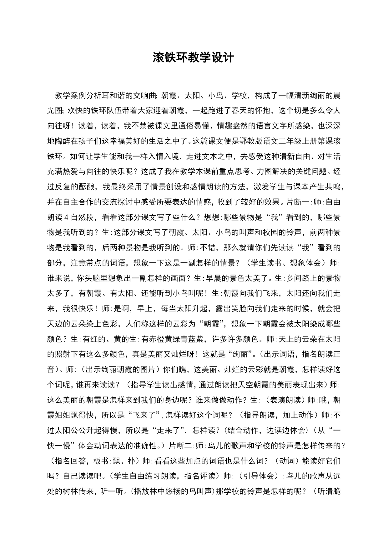 滚铁环教学设计教学案例分析耳和谐的交响曲;朝霞、太阳、小鸟、学校,构成了一幅清新绚丽的晨光图;欢快的铁环队伍带着大家迎着朝霞,一起跑进了春天的怀抱,这个切是多么令人向往呀!读着,读着,我不禁被课文里通俗易懂、情趣盎然的语言文字所感染,也深深地陶醉在孩子们这幸福美好的生活之中了。这篇课文便是鄂教版语文二年级上册第课滚铁环。如何让学生能和我一样入情入境,走进文本之中,去感受这种清新自由、对生活充满热爱与向往的快乐呢?这成了我在教学本课前重点思考、力图解决的关键问题。经过反复的酝酿,我最终采用了情景创设和感情朗