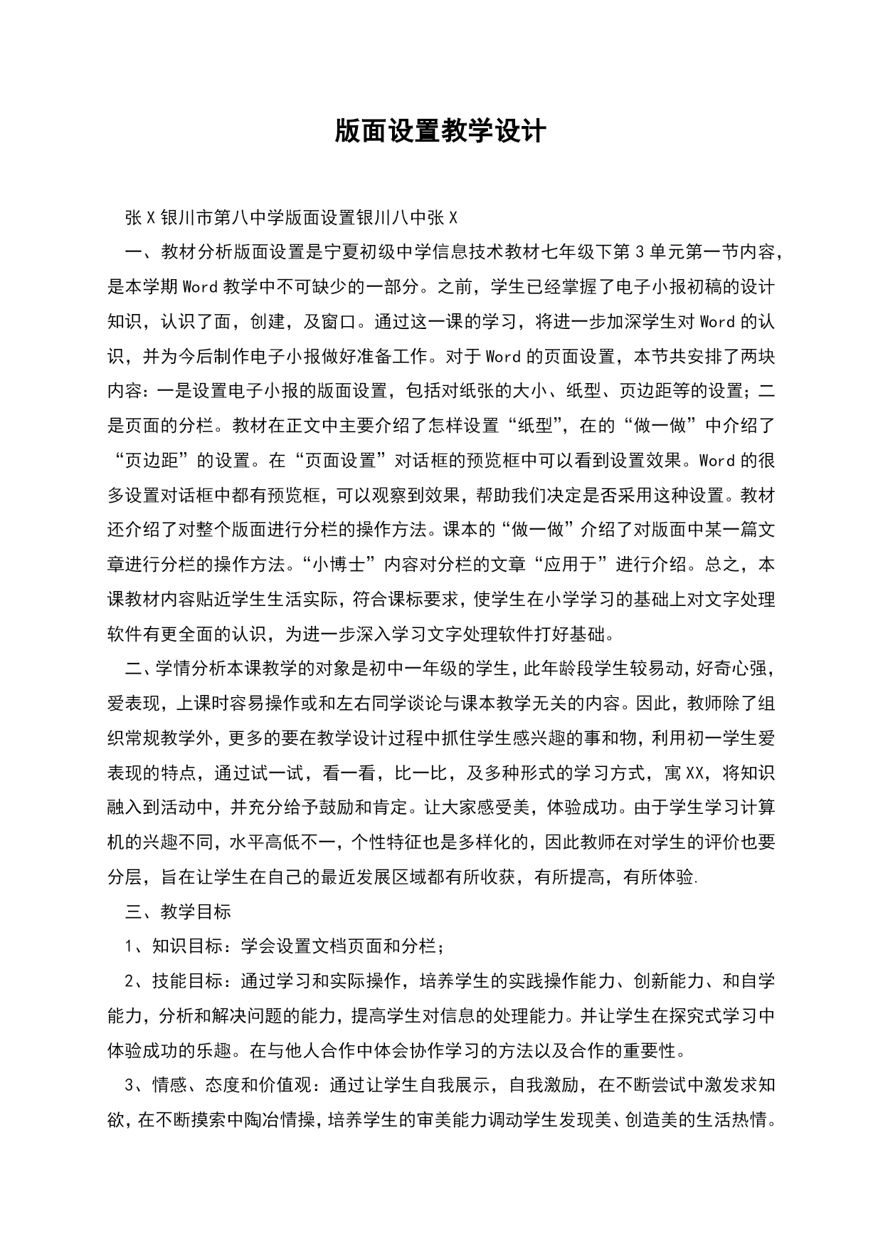版面设置教学设计张X银川市第八中学版面设置银川八中张X一、教材分析版面设置是宁夏初级中学信息技术教材七年级下第3单元第一节内容,是本学期Word教学中不可缺少的一部分。之前,学生已经掌握了电子小报初稿的设计知识,认识了面,创建,及窗口。通过这一课的学习,将进一步加深学生对Word的认识,并为今后制作电子小报做好准备工作。对于Word的页面设置,本节共安排了两块内容:一是设置电子小报的版面设置,包括对纸张的大小、纸型、页边距等的设置;二是页面的分栏。教材在正文中主要介绍了怎样设置“纸型”,在的“做一做”中介