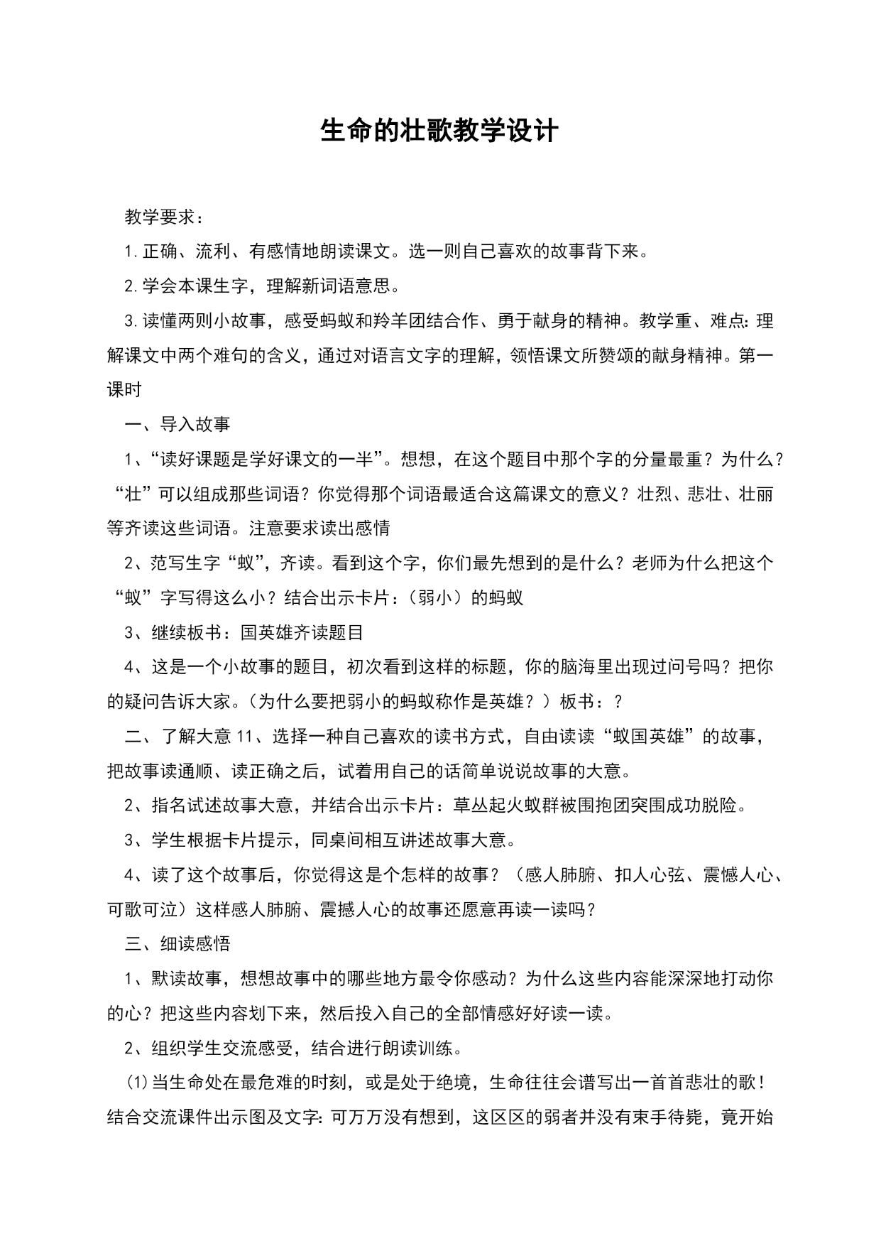 生命的壮歌教学设计教学要求:1.正确、流利、有感情地朗读课文。选一则自己喜欢的故事背下来。2.学会本课生字,理解新词语意思。3.读懂两则小故事,感受蚂蚁和羚羊团结合作、勇于献身的精神。教学重、难点:理解课文中两个难句的含义,通过对语言文字的理解,领悟课文所赞颂的献身精神。第一课时一、导入故事1、“读好课题是学好课文的一半”。想想,在这个题目中那个字的分量最重?为什么?“壮”可以组成那些词语?你觉得那个词语最适合这篇课文的意义?壮烈、悲壮、壮丽等齐读这些词语。注意要求读出感情2、范写生字“蚁”,齐读。看到这