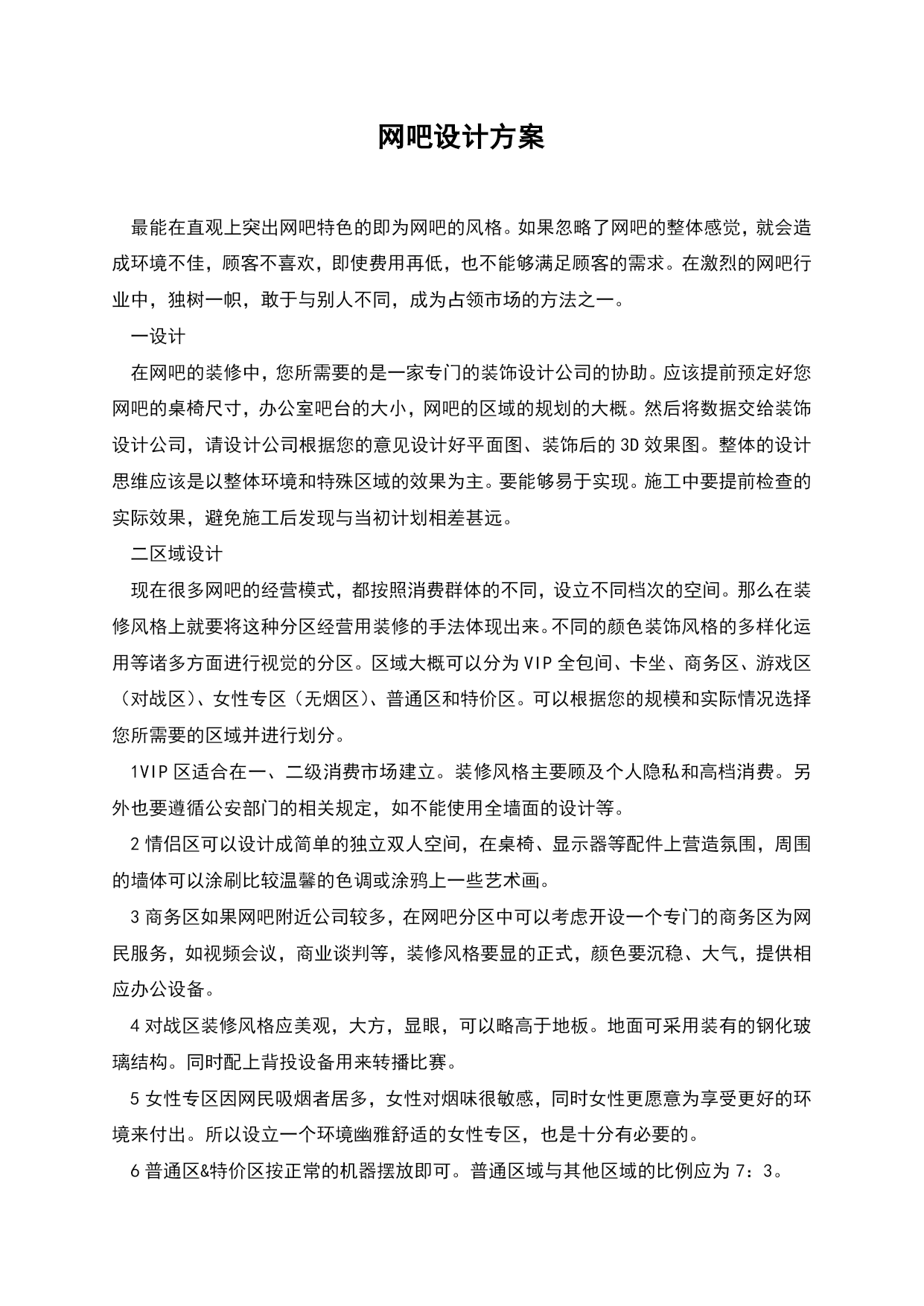 网吧设计方案最能在直观上突出网吧特色的即为网吧的风格。如果忽略了网吧的整体感觉,就会造成环境不佳,顾客不喜欢,即使费用再低,也不能够满足顾客的需求。在激烈的网吧行业中,独树一帜,敢于与别人不同,成为占领市场的方法之一。一设计在网吧的装修中,您所需要的是一家专门的装饰设计公司的协助。应该提前预定好您网吧的桌椅尺寸,办公室吧台的大小,网吧的区域的规划的大概。然后将数据交给装饰设计公司,请设计公司根据您的意见设计好平面图、装饰后的3D效果图。整体的设计思维应该是以整体环境和特殊区域的效果为主。要能够易于实现。施