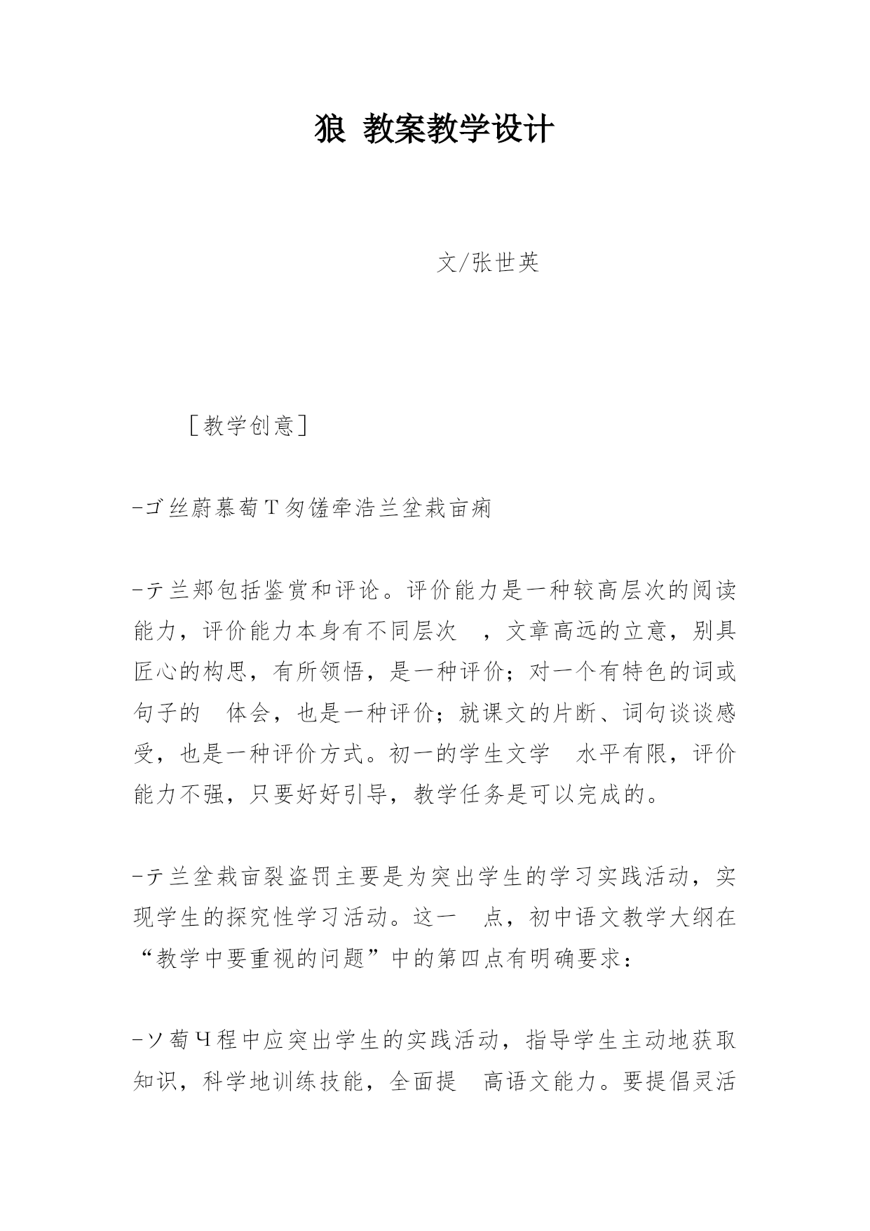 狼教案教学设计文/张世英[教学创意]-ゴ丝蔚慕萄Т匆馐牵浩兰坌栽亩痢-テ兰郏包括鉴赏和评论。评价能力是一种较高层次的阅读能力,评价能力本身有不同层次,文章高远的立意,别具匠心的构思,有所领悟,是一种评价;对一个有特色的词或句子的体会,也是一种评价;就课文的片断、词句谈谈感受,也是一种评价方式。初一的学生文学水平有限,评价能力不强,只要好好引导,教学任务是可以完成的。-テ兰坌栽亩裂盗罚主要是为突出学生的学习实践活动,实现学生的探究性学习活动。这一点,初中语文教学大纲在“教学中要重视的问题”中的第四点有明确要