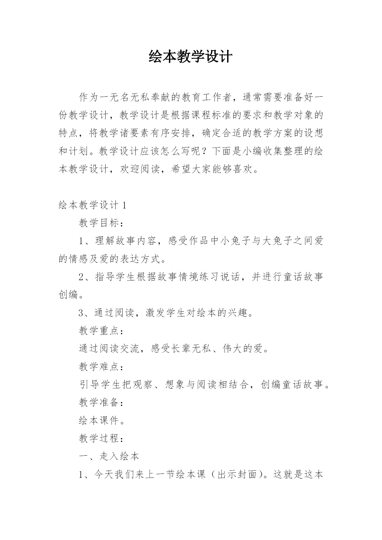 绘本教学设计作为一无名无私奉献的教育工作者,通常需要准备好一份教学设计,教学设计是根据课程标准的要求和教学对象的特点,将教学诸要素有序安排,确定合适的教学方案的设想和计划。教学设计应该怎么写呢?下面是小编收集整理的绘本教学设计,欢迎阅读,希望大家能够喜欢。绘本教学设计1教学目标:1、理解故事内容,感受作品中小兔子与大兔子之间爱的情感及爱的表达方式。2、指导学生根据故事情境练习说话,并进行童话故事创编。3、通过阅读,激发学生对绘本的兴趣。教学重点:通过阅读交流,感受长辈无私、伟大的爱。教学难点:引导学生把观