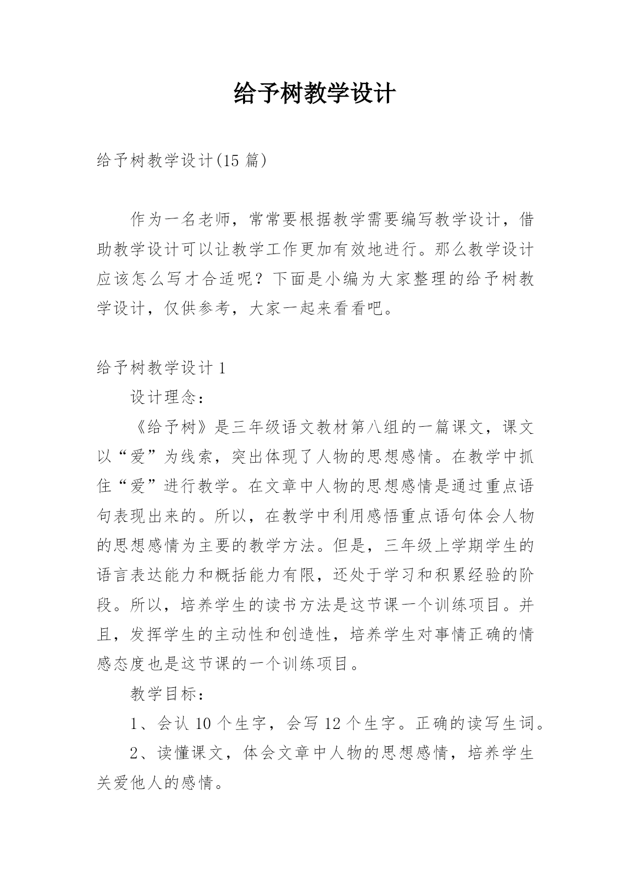 给予树教学设计给予树教学设计(15篇)作为一名老师,常常要根据教学需要编写教学设计,借助教学设计可以让教学工作更加有效地进行。那么教学设计应该怎么写才合适呢?下面是小编为大家整理的给予树教学设计,仅供参考,大家一起来看看吧。给予树教学设计1设计理念:《给予树》是三年级语文教材第八组的一篇课文,课文以“爱”为线索,突出体现了人物的思想感情。在教学中抓住“爱”进行教学。在文章中人物的思想感情是通过重点语句表现出来的。所以,在教学中利用感悟重点语句体会人物的思想感情为主要的教学方法。但是,三年级上学期学生的语言