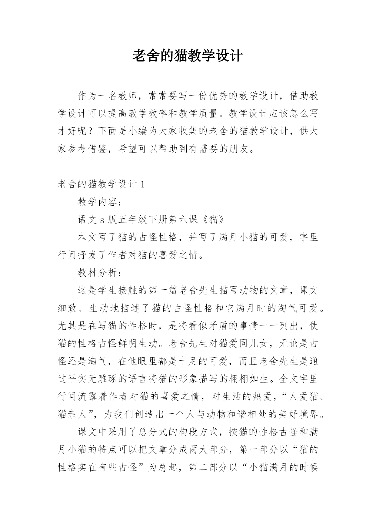 老舍的猫教学设计作为一名教师,常常要写一份优秀的教学设计,借助教学设计可以提高教学效率和教学质量。教学设计应该怎么写才好呢?下面是小编为大家收集的老舍的猫教学设计,供大家参考借鉴,希望可以帮助到有需要的朋友。老舍的猫教学设计1教学内容:语文s版五年级下册第六课《猫》本文写了猫的古怪性格,并写了满月小猫的可爱,字里行间抒发了作者对猫的喜爱之情。教材分析:这是学生接触的第一篇老舍先生描写动物的文章,课文细致、生动地描述了猫的古怪性格和它满月时的淘气可爱。尤其是在写猫的性格时,是将看似矛盾的事情一一列出,使猫的