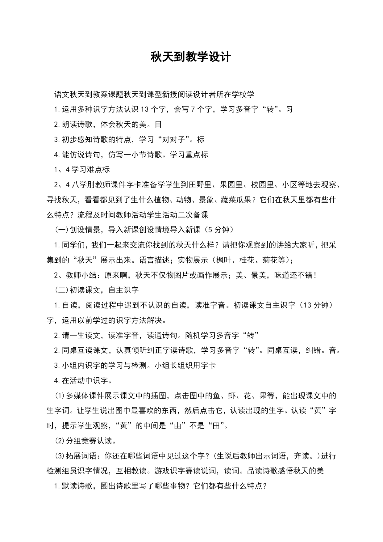秋天到教学设计语文秋天到教案课题秋天到课型新授阅读设计者所在学校学1.运用多种识字方法认识13个字,会写7个字,学习多音字“转”。习2.朗读诗歌,体会秋天的美。目3.初步感知诗歌的特点,学习“对对子”。标4.能仿说诗句,仿写一小节诗歌。学习重点标1、4学习难点标2、4八学刖教师课件字卡准备学学生到田野里、果园里、校园里、小区等地去观察、寻找秋天,看看都见到了生什么植物、动物、景象、蔬菜瓜果?它们在秋天里都有些什么特点?流程及时间教师活动学生活动二次备课(一)创设情景,导入新课创设情境导入新课(5分钟)1.