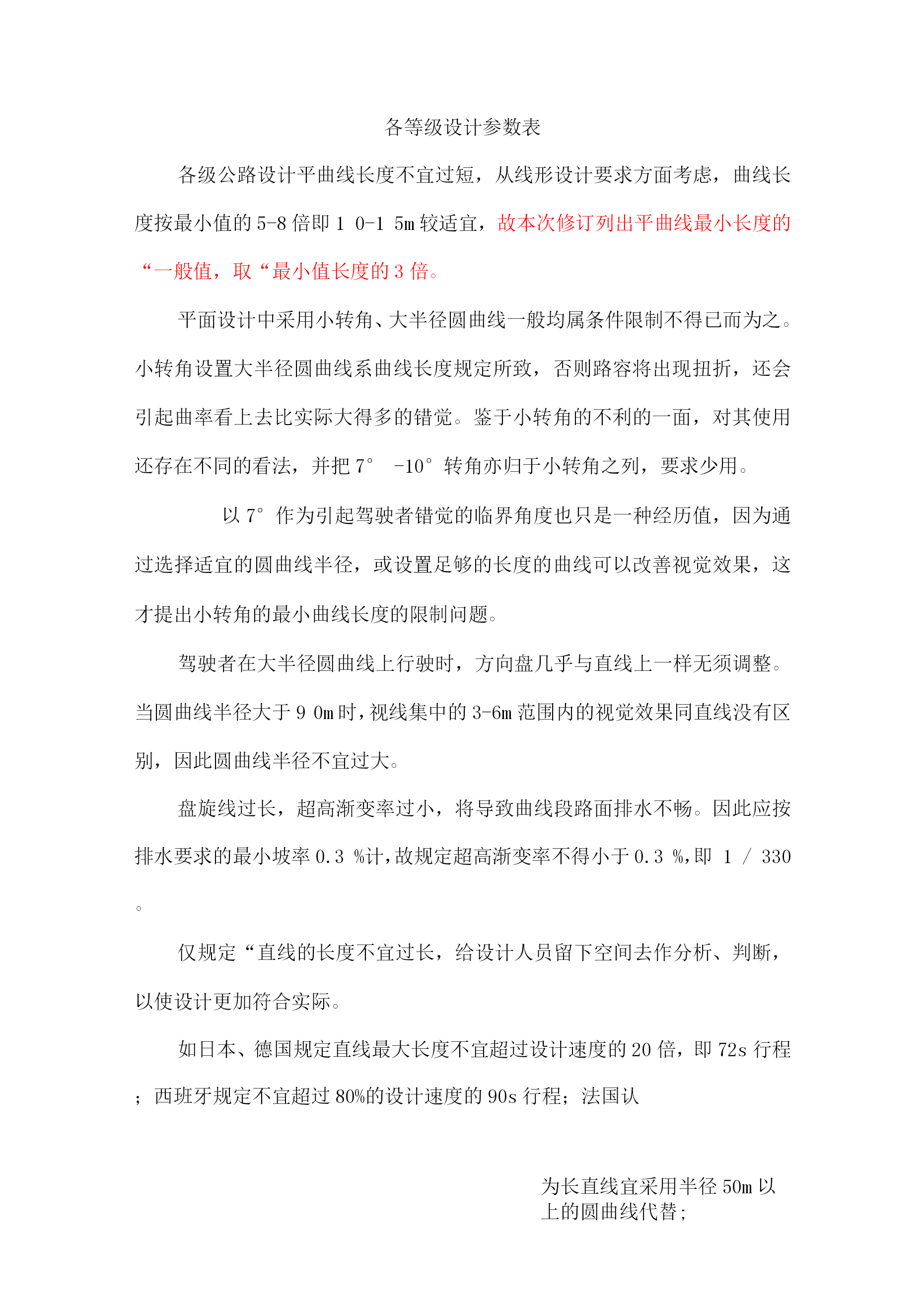 各等级设计参数表各级公路设计平曲线长度不宜过短,从线形设计要求方面考虑,曲线长度按最小值的5-8倍即10-15m较适宜,故本次修订列出平曲线最小长度的“一般值,取“最小值长度的3倍。平面设计中采用小转角、大半径圆曲线一般均属条件限制不得已而为之。小转角设置大半径圆曲线系曲线长度规定所致,否则路容将出现扭折,还会引起曲率看上去比实际大得多的错觉。鉴于小转角的不利的一面,对其使用还存在不同的看法,并把7°-10°转角亦归于小转角之列,要求少用。以7°作为引起驾驶者错觉的临界角度也只是一种经历值,因为通过选择适