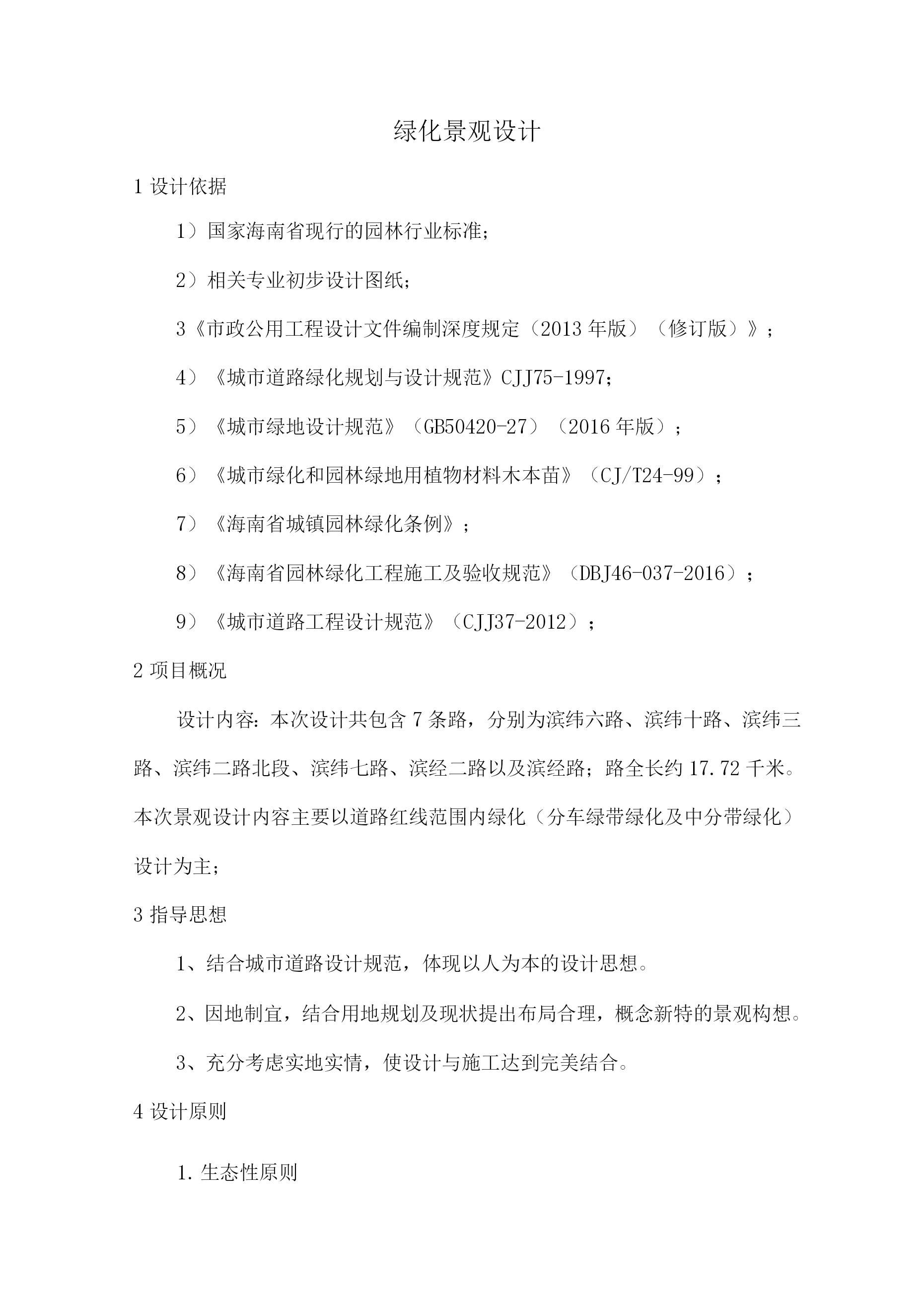 绿化景观设计1设计依据1)国家海南省现行的园林行业标准;2)相关专业初步设计图纸;3《市政公用工程设计文件编制深度规定(2013年版)(修订版)》;4)《城市道路绿化规划与设计规范》CJJ75-1997;5)《城市绿地设计规范》(GB50420-27)(2016年版);6)《城市绿化和园林绿地用植物材料木本苗》(CJ/T24-99);7)《海南省城镇园林绿化条例》;8)《海南省园林绿化工程施工及验收规范》(DBJ46-037-2016);9)《城市道路工程设计规范》(CJJ37-2012);2项目概况设计