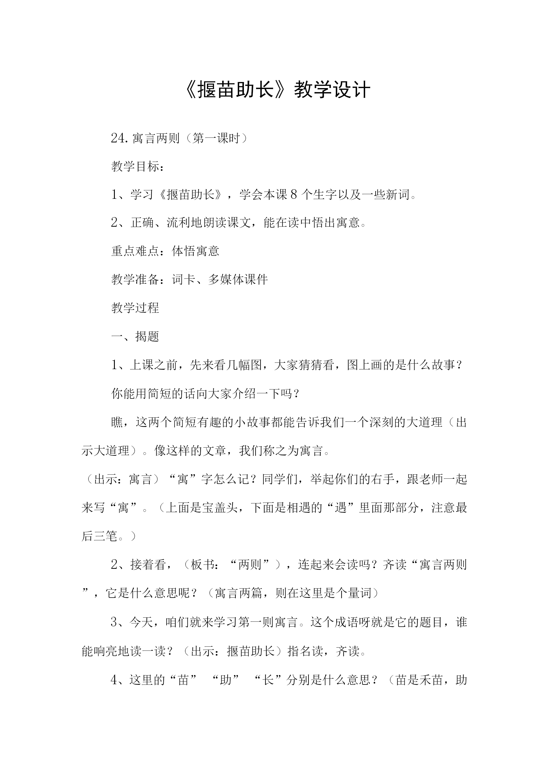 《揠苗助长》教学设计24.寓言两则(第一课时)教学目标:1、学习《揠苗助长》,学会本课8个生字以及一些新词。2、正确、流利地朗读课文,能在读中悟出寓意。重点难点:体悟寓意教学准备:词卡、多媒体课件教学过程一、揭题1、上课之前,先来看几幅图,大家猜猜看,图上画的是什么故事?你能用简短的话向大家介绍一下吗?瞧,这两个简短有趣的小故事都能告诉我们一个深刻的大道理(出示大道理)。像这样的文章,我们称之为寓言。(出示:寓言)“寓”字怎么记?同学们,举起你们的右手,跟老师一起来写“寓”。(上面是宝盖头,下面是相遇的“