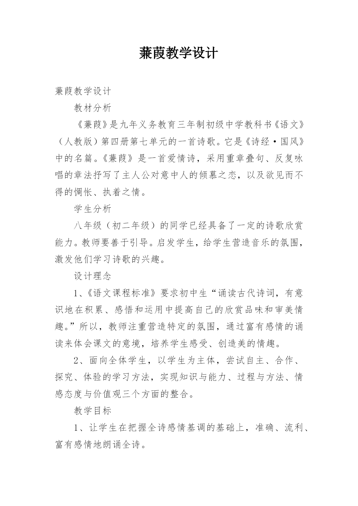 蒹葭教学设计蒹葭教学设计教材分析《蒹葭》是九年义务教育三年制初级中学教科书《语文》(人教版)第四册第七单元的一首诗歌。它是《诗经·国风》中的名篇。《蒹葭》是一首爱情诗,采用重章叠句、反复咏唱的章法抒写了主人公对意中人的倾慕之恋,以及欲见而不得的惆怅、执着之情。学生分析八年级(初二年级)的同学已经具备了一定的诗歌欣赏能力。教师要善于引导。启发学生,给学生营造音乐的氛围,激发他们学习诗歌的兴趣。设计理念1、《语文课程标准》要求初中生“诵读古代诗词,有意识地在积累、感悟和运用中提高自己的欣赏品味和审美情趣。”所