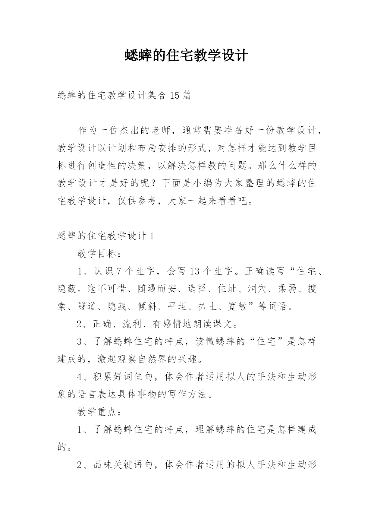 蟋蟀的住宅教学设计蟋蟀的住宅教学设计集合15篇作为一位杰出的老师,通常需要准备好一份教学设计,教学设计以计划和布局安排的形式,对怎样才能达到教学目标进行创造性的决策,以解决怎样教的问题。那么什么样的教学设计才是好的呢?下面是小编为大家整理的蟋蟀的住宅教学设计,仅供参考,大家一起来看看吧。蟋蟀的住宅教学设计1教学目标:1、认识7个生字,会写13个生字。正确读写“住宅、隐蔽。毫不可惜、随遇而安、选择、住址、洞穴、柔弱、搜索、隧道、隐藏、倾斜、平坦、扒土、宽敞”等词语。2、正确、流利、有感情地朗读课文。3、了解