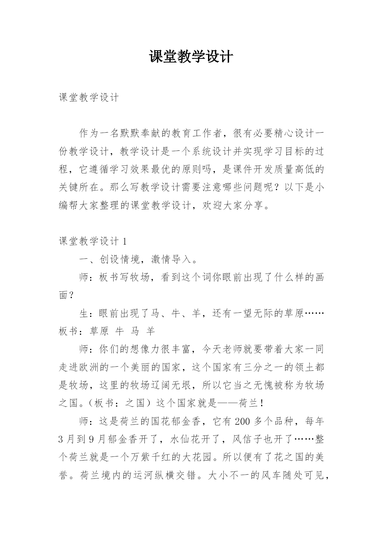课堂教学设计课堂教学设计作为一名默默奉献的教育工作者,很有必要精心设计一份教学设计,教学设计是一个系统设计并实现学习目标的过程,它遵循学习效果最优的原则吗,是课件开发质量高低的关键所在。那么写教学设计需要注意哪些问题呢?以下是小编帮大家整理的课堂教学设计,欢迎大家分享。课堂教学设计1一、创设情境,激情导入。师:板书写牧场,看到这个词你眼前出现了什么样的画面?生:眼前出现了马、牛、羊,还有一望无际的草原……板书:草原牛马羊师:你们的想像力很丰富,今天老师就要带着大家一同走进欧洲的一个美丽的国家,这个国家有三