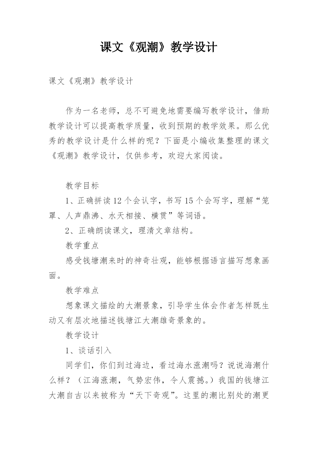 课文《观潮》教学设计课文《观潮》教学设计作为一名老师,总不可避免地需要编写教学设计,借助教学设计可以提高教学质量,收到预期的教学效果。那么优秀的教学设计是什么样的呢?下面是小编收集整理的课文《观潮》教学设计,仅供参考,欢迎大家阅读。教学目标1、正确拼读12个会认字,书写15个会写字,理解“笼罩、人声鼎沸、水天相接、横贯”等词语。2、正确朗读课文,理清文章结构。教学重点感受钱塘潮来时的神奇壮观,能够根据语言描写想象画面。教学难点想象课文描绘的大潮景象,引导学生体会作者怎样既生动又有层次地描述钱塘江大潮雄奇景