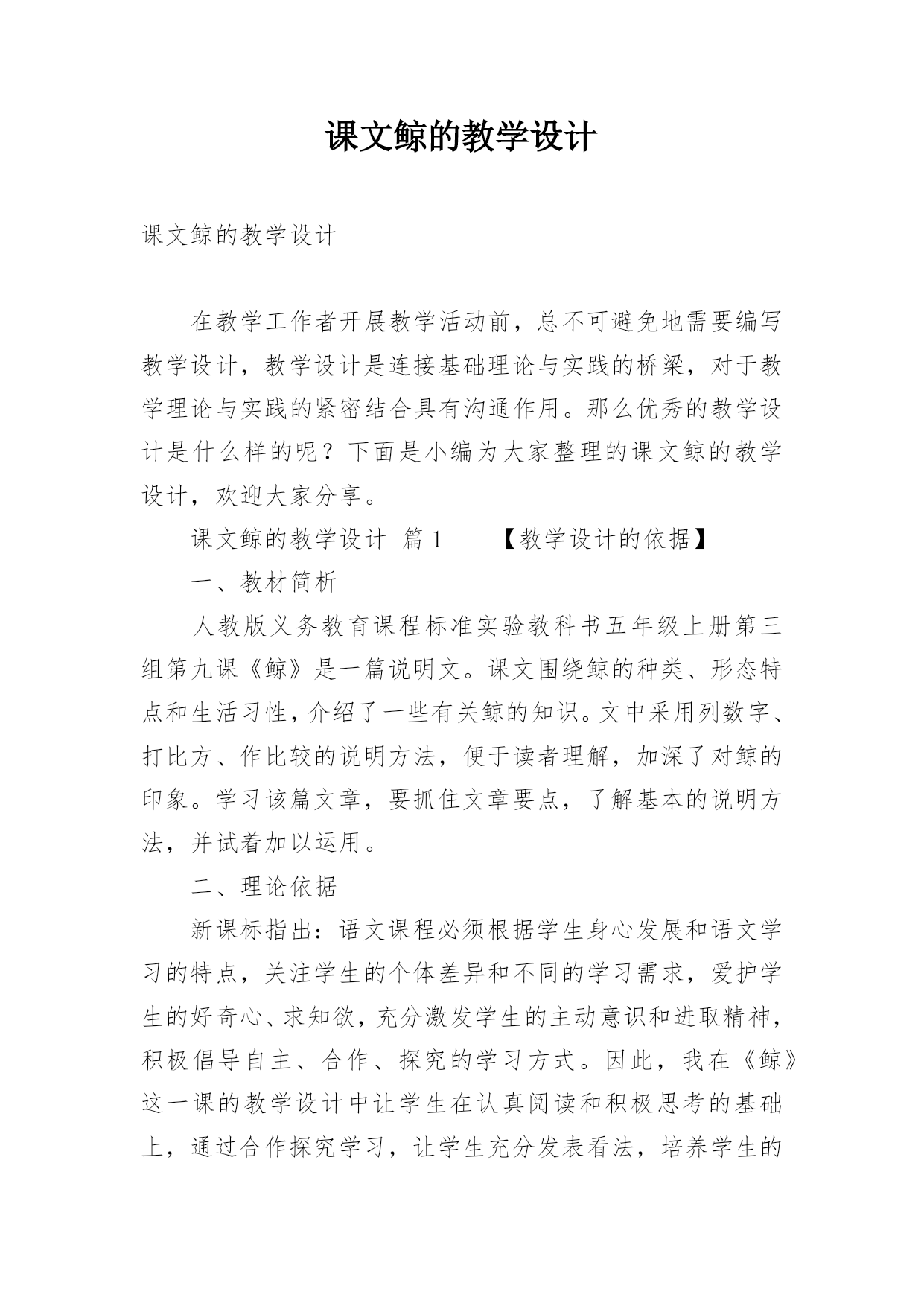 课文鲸的教学设计课文鲸的教学设计在教学工作者开展教学活动前,总不可避免地需要编写教学设计,教学设计是连接基础理论与实践的桥梁,对于教学理论与实践的紧密结合具有沟通作用。那么优秀的教学设计是什么样的呢?下面是小编为大家整理的课文鲸的教学设计,欢迎大家分享。课文鲸的教学设计篇1【教学设计的依据】一、教材简析人教版义务教育课程标准实验教科书五年级上册第三组第九课《鲸》是一篇说明文。课文围绕鲸的种类、形态特点和生活习性,介绍了一些有关鲸的知识。文中采用列数字、打比方、作比较的说明方法,便于读者理解,加深了对鲸的印