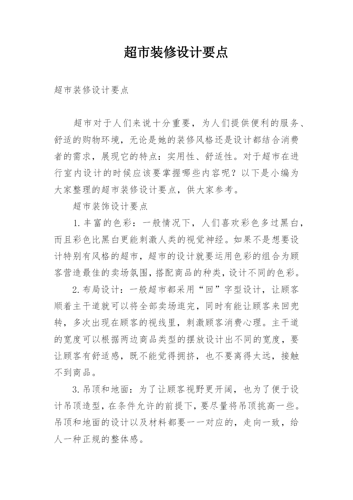 超市装修设计要点超市装修设计要点超市对于人们来说十分重要,为人们提供便利的服务、舒适的购物环境,无论是她的装修风格还是设计都结合消费者的需求,展现它的特点:实用性、舒适性。对于超市在进行室内设计的时候应该要掌握哪些内容呢?以下是小编为大家整理的超市装修设计要点,供大家参考。超市装饰设计要点1.丰富的色彩:一般情况下,人们喜欢彩色多过黑白,而且彩色比黑白更能刺激人类的视觉神经。如果不是想要设计特别有风格的超市,超市的设计就要运用色彩的组合为顾客营造最佳的卖场氛围,搭配商品的种类,设计不同的色彩。2.布局设计
