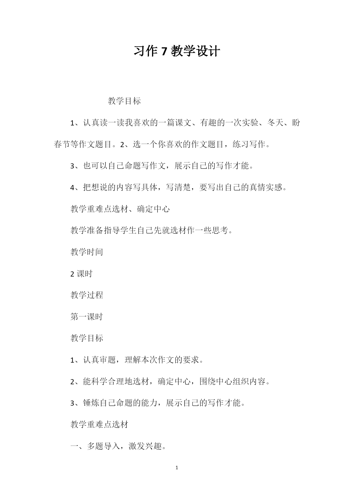 PAGEPAGE4习作7教学设计教学目标1、认真读一读我喜欢的一篇课文、有趣的一次实验、冬天、盼春节等作文题目。2、选一个你喜欢的作文题目,练习写作。3、也可以自己命题写作文,展示自己的写作才能。4、把想说的内容写具体,写清楚,要写出自己的真情实感。教学重难点选材、确定中心教学准备指导学生自己先就选材作一些思考。教学时间2课时教学过程第一课时教学目标1、认真审题,理解本次作文的要求。2、能科学合理地选材,确定中心,围绕中心组织内容。3、锤炼自己命题的能力,展示自己的写作才能。教学重难点选材一、