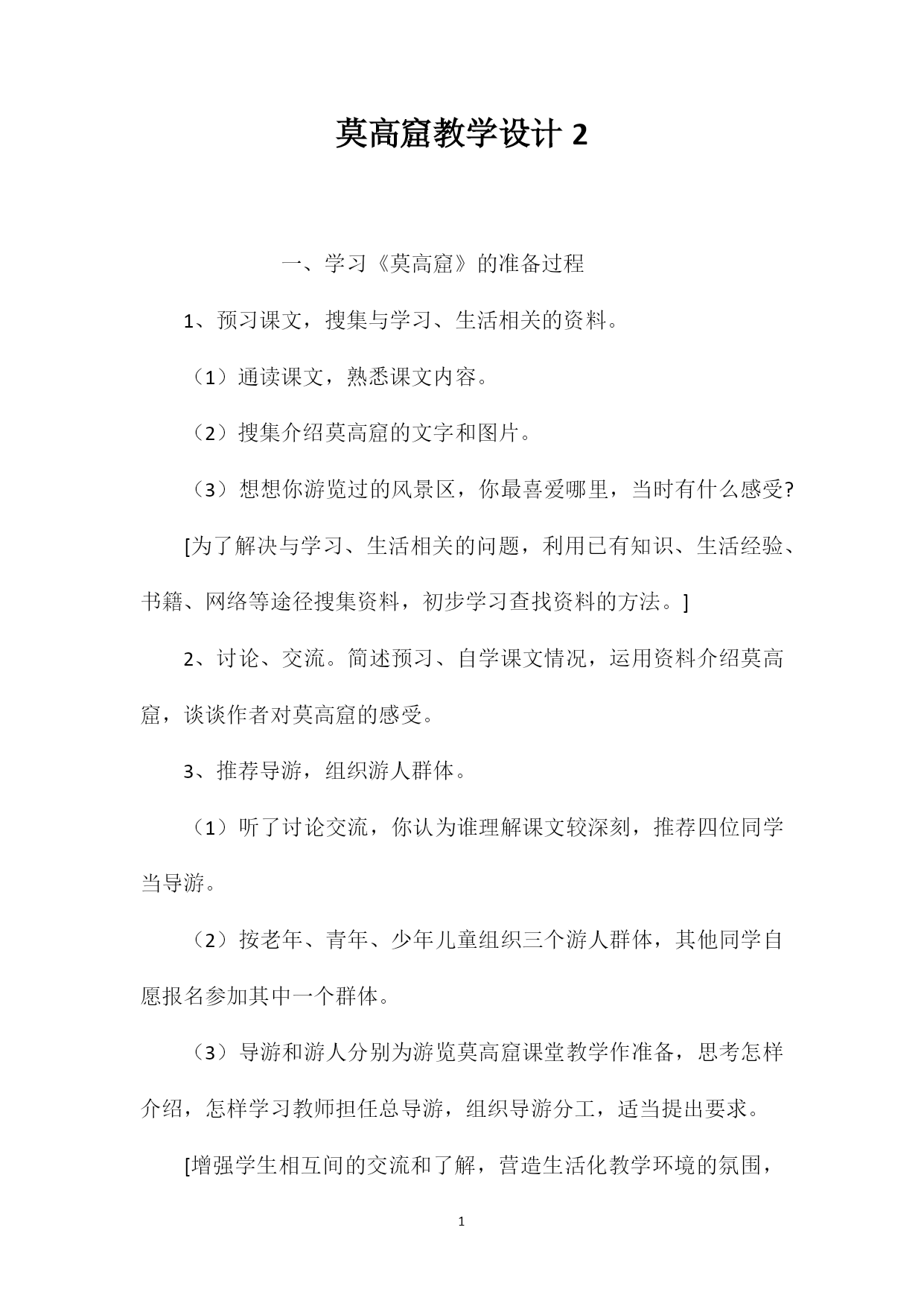 PAGEPAGE6莫高窟教学设计2一、学习《莫高窟》的准备过程1、预习课文,搜集与学习、生活相关的资料。(1)通读课文,熟悉课文内容。(2)搜集介绍莫高窟的文字和图片。(3)想想你游览过的风景区,你最喜爱哪里,当时有什么感受?[为了解决与学习、生活相关的问题,利用已有知识、生活经验、书籍、网络等途径搜集资料,初步学习查找资料的方法。]2、讨论、交流。简述预习、自学课文情况,运用资料介绍莫高窟,谈谈作者对莫高窟的感受。3、推荐导游,组织游人群体。(1)听了讨论交流,你认为谁理解课文较深刻,推荐四