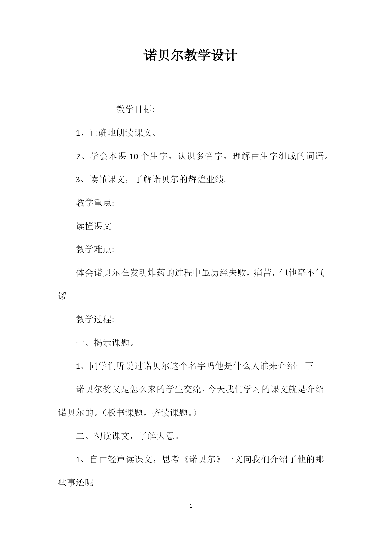 PAGEPAGE3诺贝尔教学设计教学目标:1、正确地朗读课文。2、学会本课10个生字,认识多音字,理解由生字组成的词语。3、读懂课文,了解诺贝尔的辉煌业绩.教学重点:读懂课文教学难点:体会诺贝尔在发明炸药的过程中虽历经失败,痛苦,但他毫不气馁教学过程:一、揭示课题。1、同学们听说过诺贝尔这个名字吗他是什么人谁来介绍一下诺贝尔奖又是怎么来的学生交流。今天我们学习的课文就是介绍诺贝尔的。(板书课题,齐读课题。)二、初读课文,了解大意。1、自由轻声读课文,思考《诺贝尔》一文向我们介绍了他的那些事迹呢