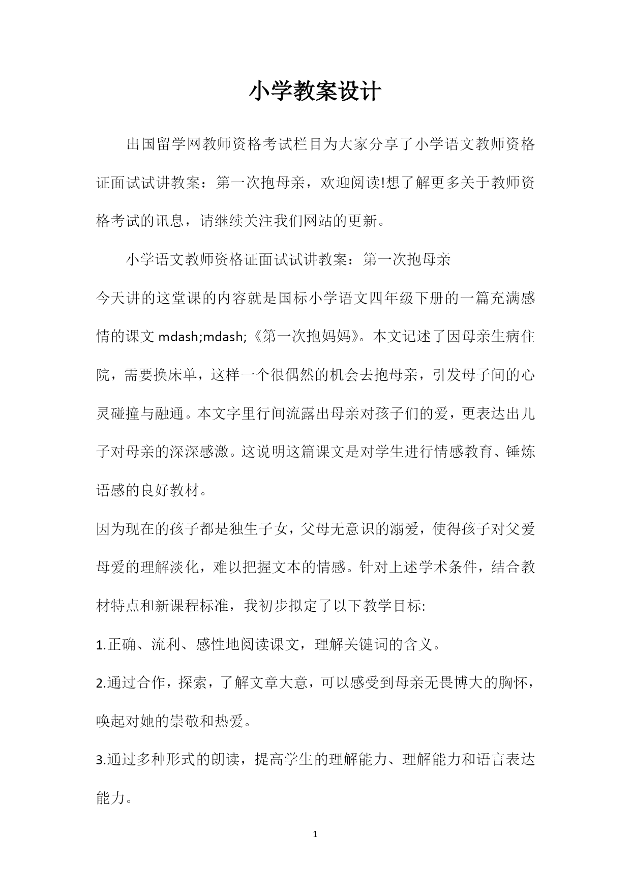 PAGEPAGE3小学教案设计出国留学网教师资格考试栏目为大家分享了小学语文教师资格证面试试讲教案:第一次抱母亲,欢迎阅读!想了解更多关于教师资格考试的讯息,请继续关注我们网站的更新。小学语文教师资格证面试试讲教案:第一次抱母亲今天讲的这堂课的内容就是国标小学语文四年级下册的一篇充满感情的课文mdash;mdash;《第一次抱妈妈》。本文记述了因母亲生病住院,需要换床单,这样一个很偶然的机会去抱母亲,引发母子间的心灵碰撞与融通。本文字里行间流露出母亲对孩子们的爱,更表达出儿子对母亲的深深感激。