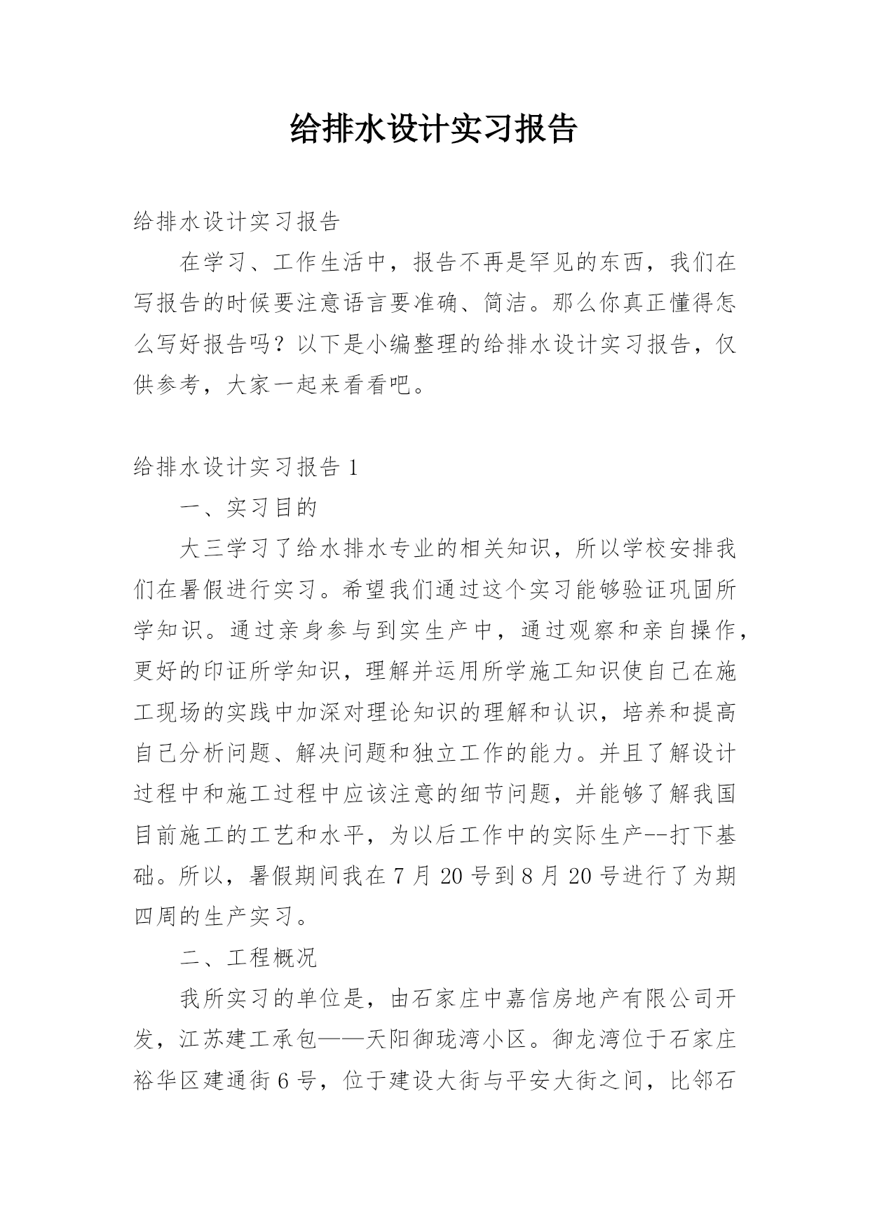 给排水设计实习报告给排水设计实习报告在学习、工作生活中,报告不再是罕见的东西,我们在写报告的时候要注意语言要准确、简洁。那么你真正懂得怎么写好报告吗?以下是小编整理的给排水设计实习报告,仅供参考,大家一起来看看吧。给排水设计实习报告1一、实习目的大三学习了给水排水专业的相关知识,所以学校安排我们在暑假进行实习。希望我们通过这个实习能够验证巩固所学知识。通过亲身参与到实生产中,通过观察和亲自操作,更好的印证所学知识,理解并运用所学施工知识使自己在施工现场的实践中加深对理论知识的理解和认识,培养和提高自己分析