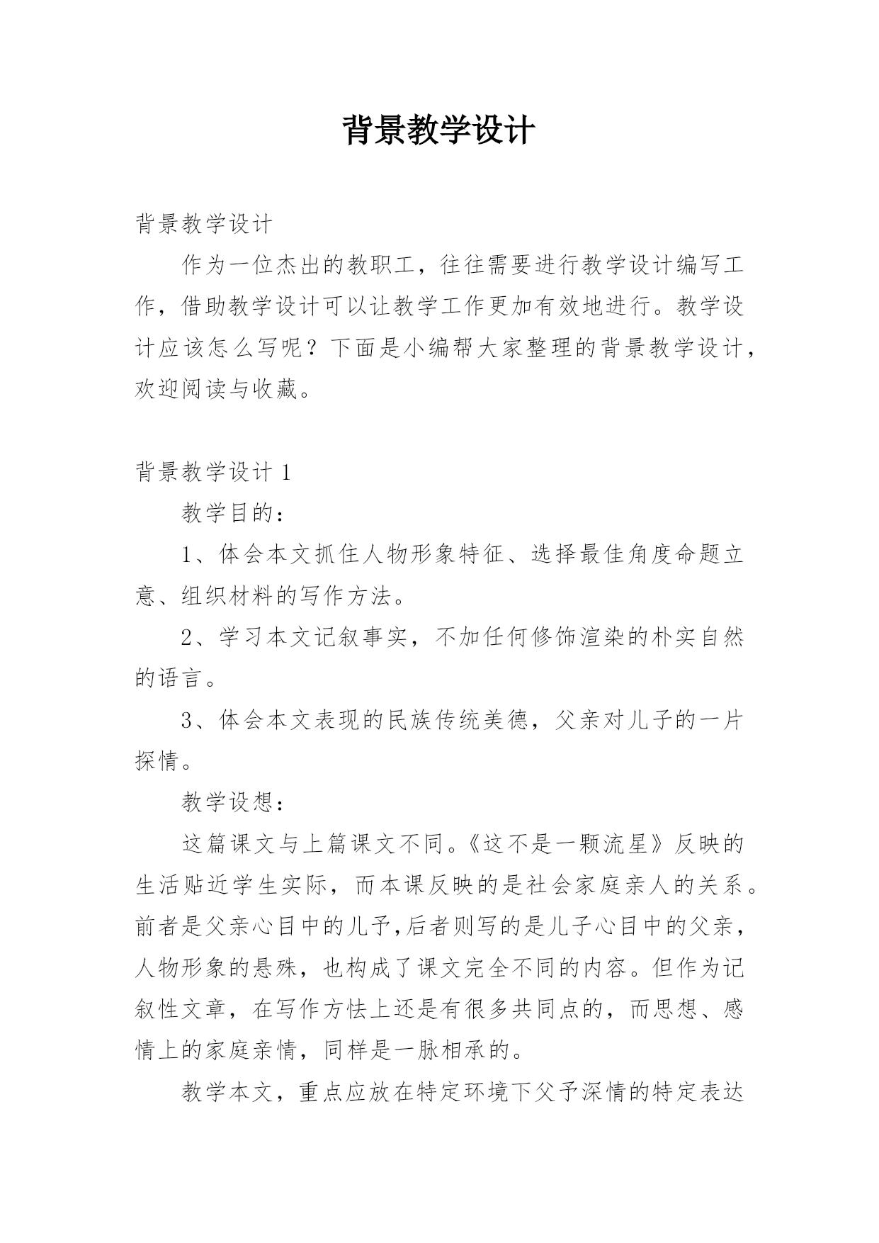 背景教学设计背景教学设计作为一位杰出的教职工,往往需要进行教学设计编写工作,借助教学设计可以让教学工作更加有效地进行。教学设计应该怎么写呢?下面是小编帮大家整理的背景教学设计,欢迎阅读与收藏。背景教学设计1教学目的:1、体会本文抓住人物形象特征、选择最佳角度命题立意、组织材料的写作方法。2、学习本文记叙事实,不加任何修饰渲染的朴实自然的语言。3、体会本文表现的民族传统美德,父亲对儿子的一片探情。教学设想:这篇课文与上篇课文不同。《这不是一颗流星》反映的生活贴近学生实际,而本课反映的是社会家庭亲人的关系。前