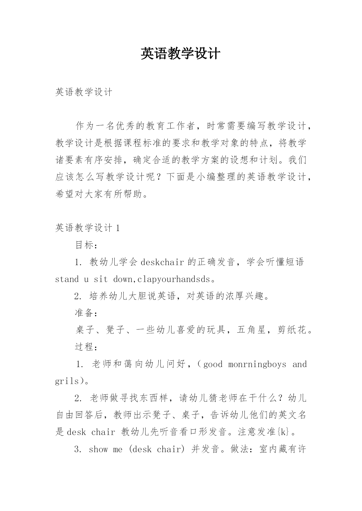 英语教学设计英语教学设计作为一名优秀的教育工作者,时常需要编写教学设计,教学设计是根据课程标准的要求和教学对象的特点,将教学诸要素有序安排,确定合适的教学方案的设想和计划。我们应该怎么写教学设计呢?下面是小编整理的英语教学设计,希望对大家有所帮助。英语教学设计1目标:1.教幼儿学会deskchair的正确发音,学会听懂短语standusitdown,clapyourhandsds。2.培养幼儿大胆说英语,对英语的浓厚兴趣。准备:桌子、凳子、一些幼儿喜爱的玩具,五角星,剪纸花。过程:1.老师和蔼向幼儿问好,