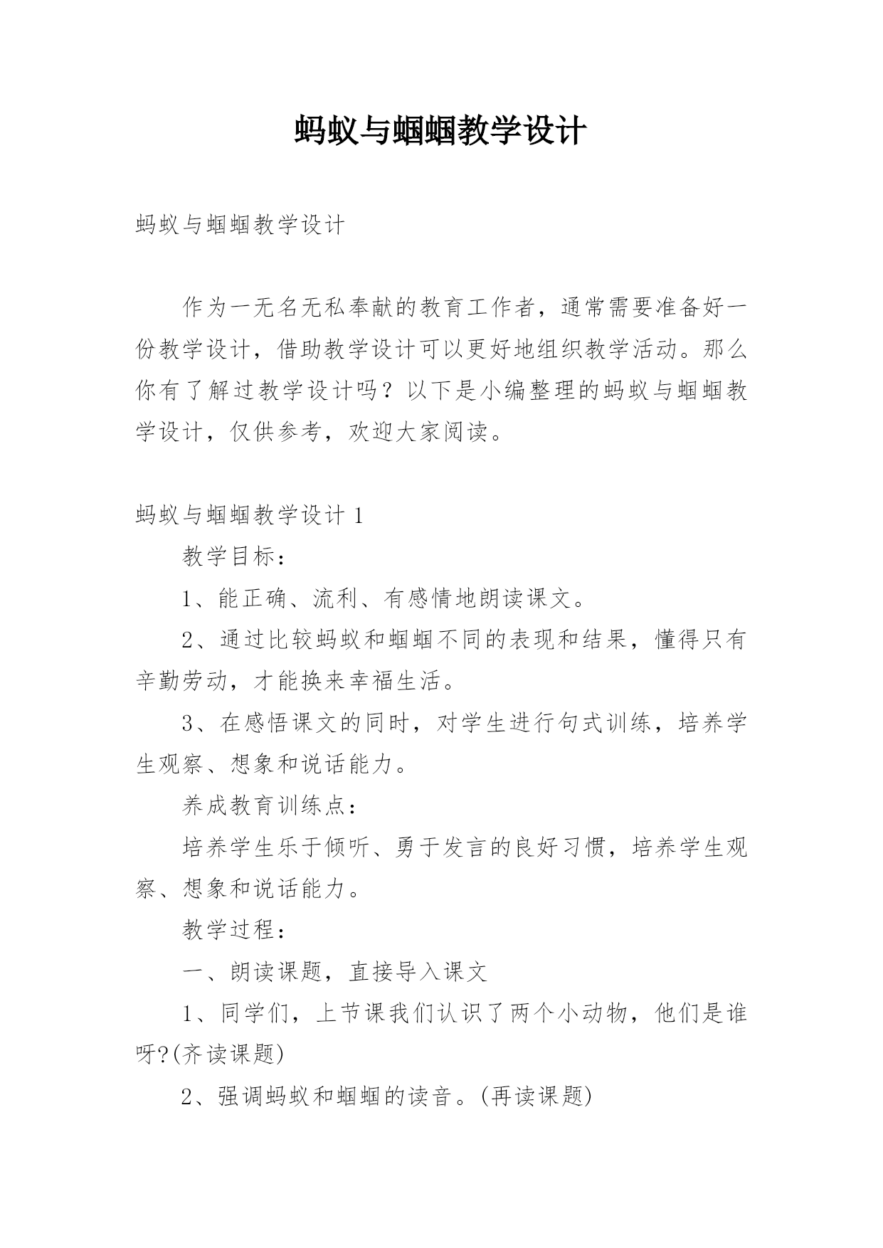 蚂蚁与蝈蝈教学设计蚂蚁与蝈蝈教学设计作为一无名无私奉献的教育工作者,通常需要准备好一份教学设计,借助教学设计可以更好地组织教学活动。那么你有了解过教学设计吗?以下是小编整理的蚂蚁与蝈蝈教学设计,仅供参考,欢迎大家阅读。蚂蚁与蝈蝈教学设计1教学目标:1、能正确、流利、有感情地朗读课文。2、通过比较蚂蚁和蝈蝈不同的表现和结果,懂得只有辛勤劳动,才能换来幸福生活。3、在感悟课文的同时,对学生进行句式训练,培养学生观察、想象和说话能力。养成教育训练点:培养学生乐于倾听、勇于发言的良好习惯,培养学生观察、想象和说话